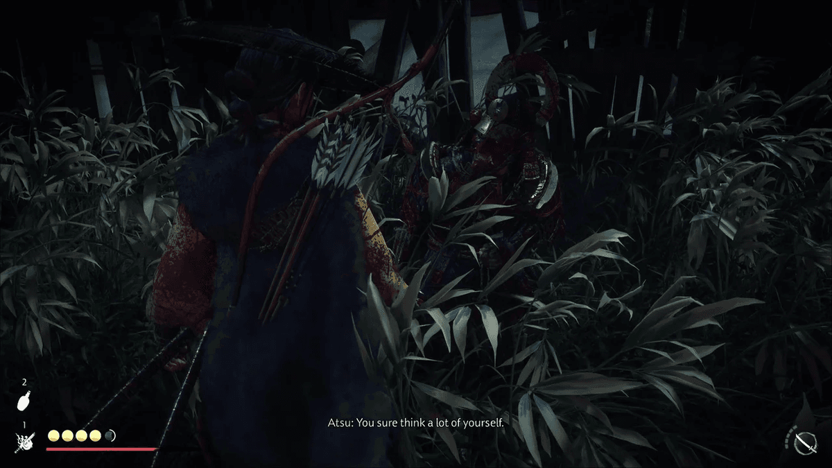 В деревянной стене увидишь проём, через который можно забраться в ближайшую палатку. Во дворике Ацу придётся разобраться ещё с несколькими самураями Мунэдзи. Заманивай их в отдалённые зоны или отстреливай из лука. Когда будешь готов, нападай на самого Костолома.
