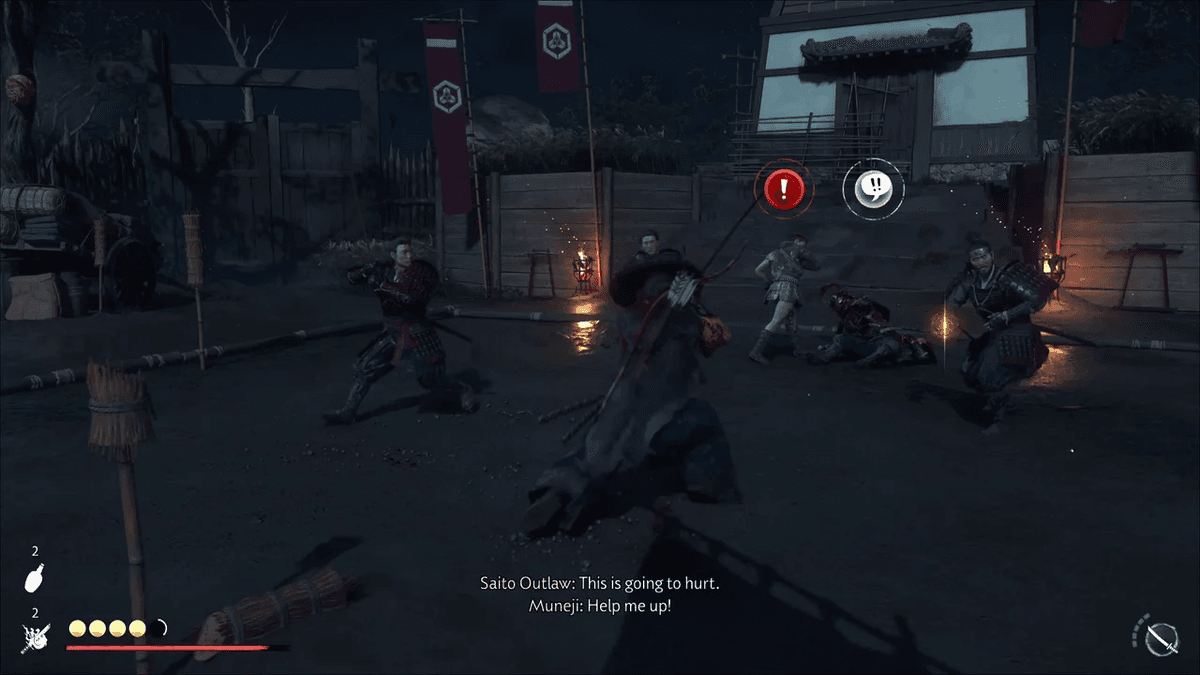 Босс использует гигантской копьё, атаки которого удобнее всего отражать с помощью двойных катан. Но больше всего проблем в этом бою наверняка доставят сообщники Костолома, так что сначала лучше разобраться с ними с помощью Воя Онрё или стрелкового оружия. Если станет слишком сложно, побегай вокруг Мунэдзи в поисках метатльного оружия и копий — они и босса ранят, и с его «друзьями» помогут разобраться. Когда нанесёшь Мунэдзи достаточно урона, на тебя нападёт ещё одна группа людей Сайто.
