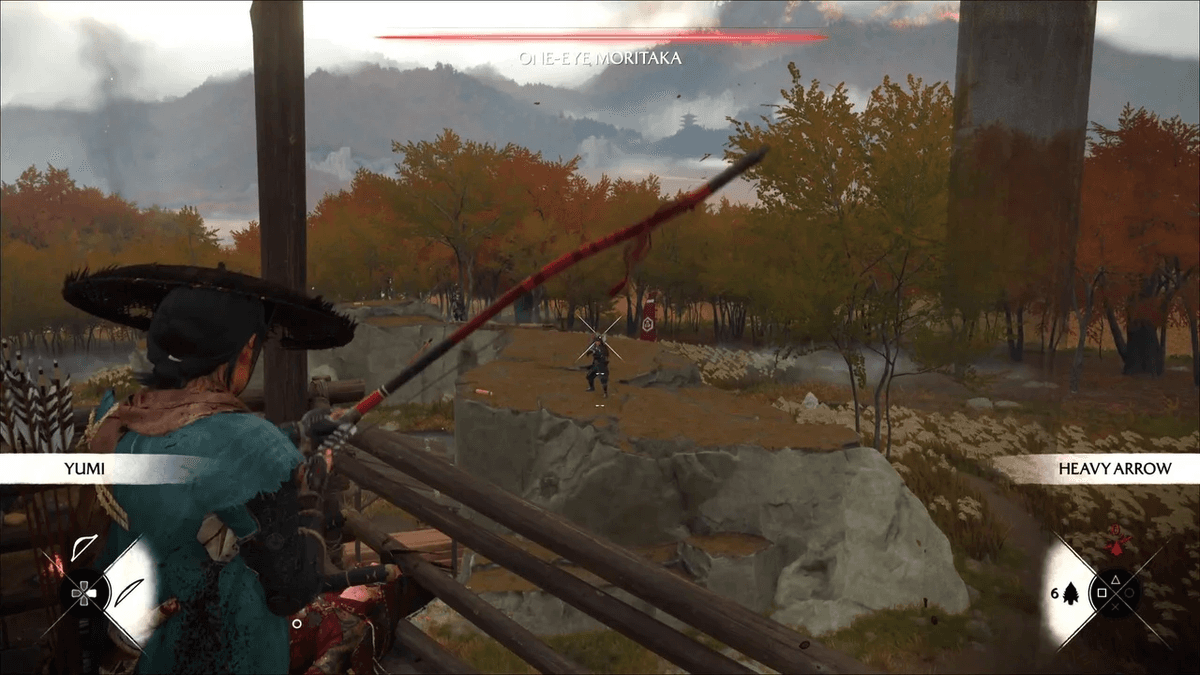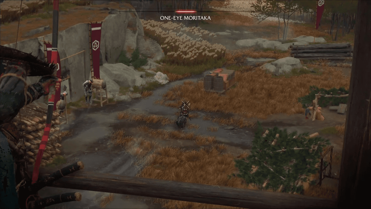Можешь попробовать рвануть к боссу и зарубить его катаной, вот только лучник начнёт бегать по локации и искать удобную позицию для выстрела. Лучше забраться на смотровую вышку и просто стрелять в него из лука юми, пока Одноглазый не упадёт замертво — он почти не будет «давать сдачи». Кстати, если к этому моменту ты ещё не зачистил лагерь, сделать это можно точно так же с этой же вышки.