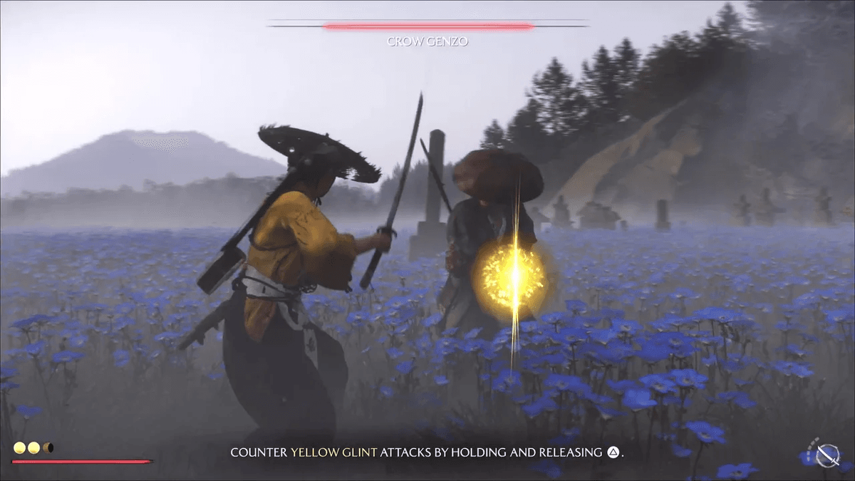 А ещё Ворон любит обезоруживать врагов, поэтому особенно внимательно следи за жёлтым сиянием на его клинке. Когда увидишь — зажми и отпусти «треугольник», чтобы ударить первым.