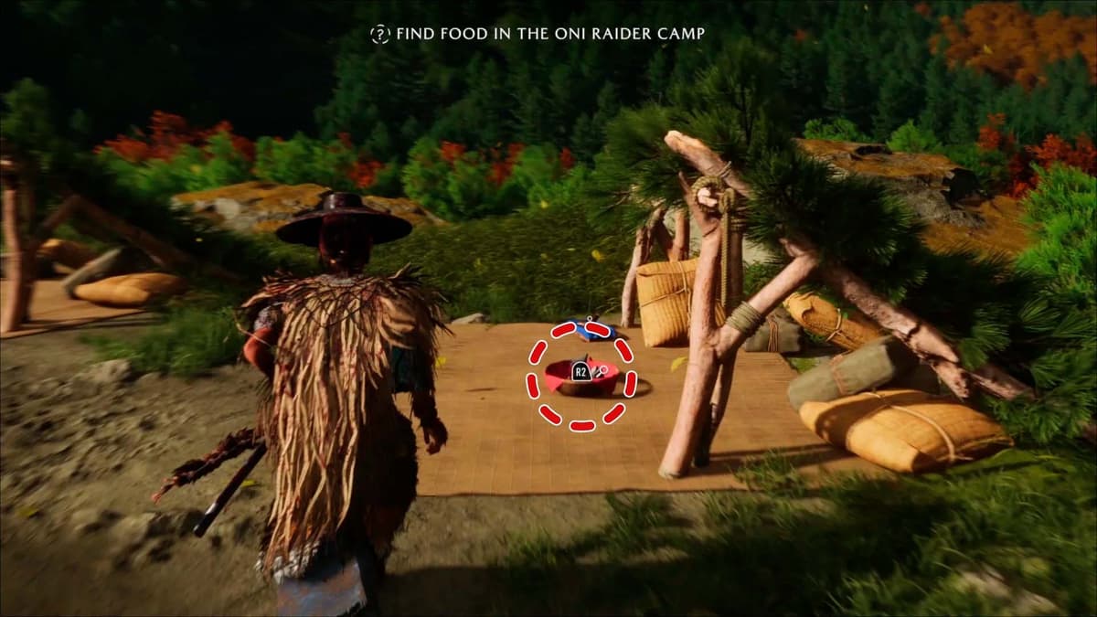 Иди по тропе между двумя деревьями с масками Они. В конце — лагерь рейдеров Они. У первой палатки лежит подозрительный лосось — забери. Осмотри большой ларец с ресурсами: там могут быть фрагменты маски рейдера Они — они нужны для прокачки оружия. Не пропускай.