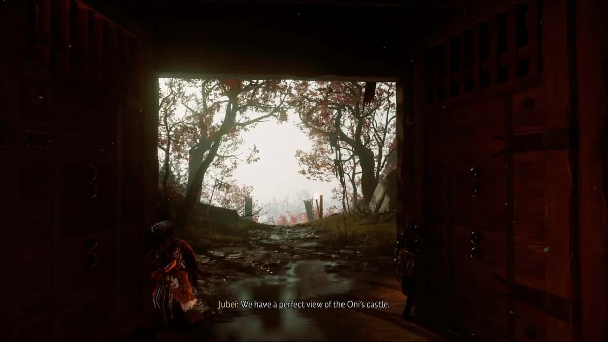 После боя Дзюбэй ведёт тебя к двери. Открой створки — увидишь свою первую панораму равнины Исикари. Иди по мосту в стан Мацумэ.