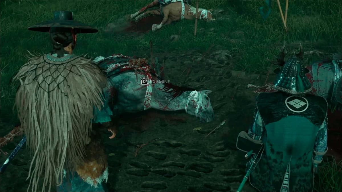 Следуй за лордом Китамори. По пути собирай материалы у обочины — медная руда попадается часто. Вскоре вы наткнётесь на павших лошадей Мацумэ. Остановитесь, чтобы разобраться, что произошло.