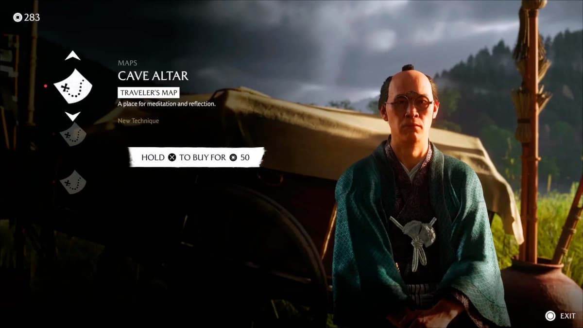 У телеги с вывеской горы Ётэя стоит Исабуро. Он продаёт фрагменты, которые «добавляются» в твою карту мира.