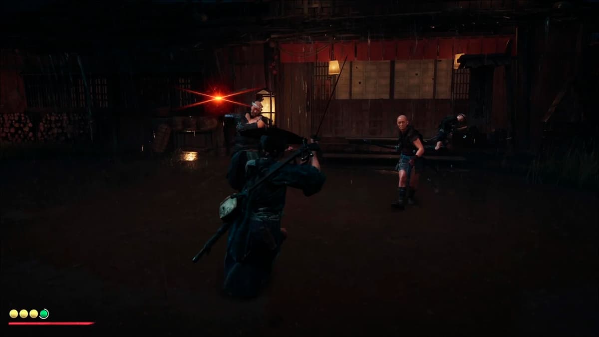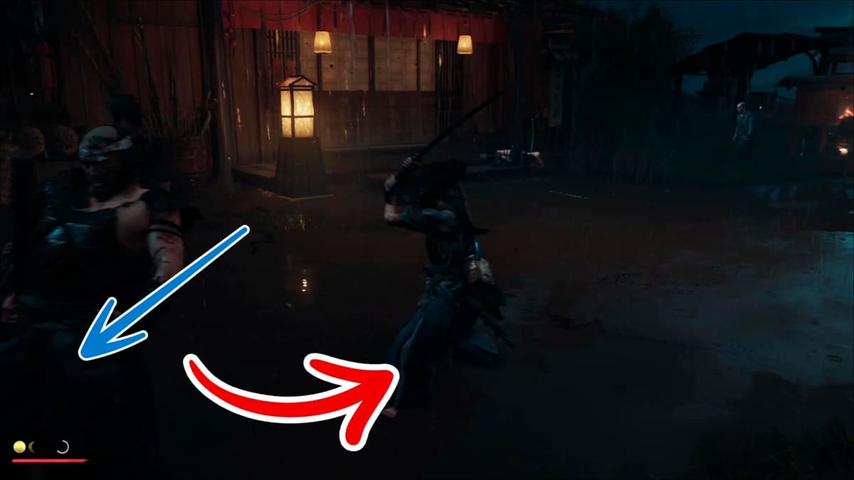 Перед боем зафиксируй камеру на ближайшем враге и не увлекайся перекатами. Ступени у крыльца – твой щит: на них легко ломать дистанцию и сбивать прицел лучникам. Если чуть отойти к бочкам, громилы начинают толкаться в проходе, и их замахи читаются лучше.