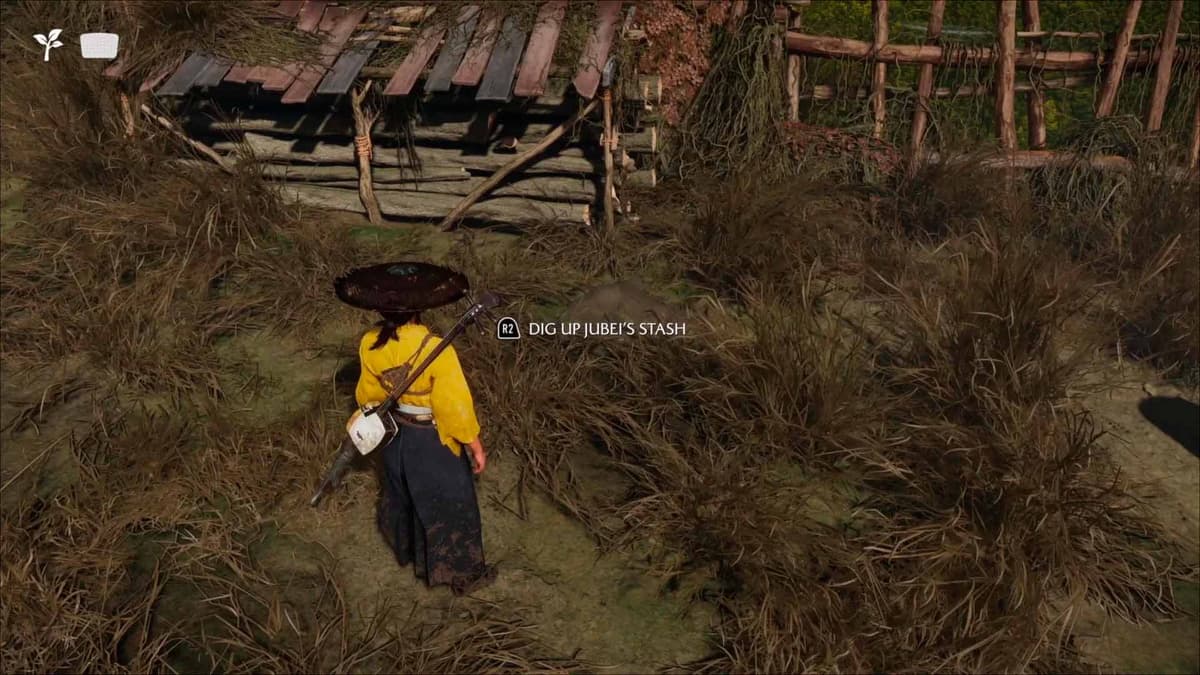 С левой стороны участка, ближе к нужнику, заметишь мутноватый силуэт, вокруг кружатся листья. Подойди – Ацу вспомнит, как Дзюбэй мечтал стать самураем. Удерживай тачпад, чтобы войти в прошлое и досмотреть сцену (активируется R2).