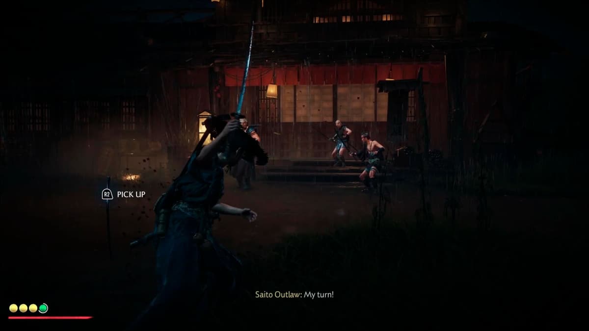 Прочитай (R2): «Глаз сёгуна глядит на север, Мацумэ служат чужим интересам, а Сайто «защитят дом» каждому, кто примкнёт». Закрывай табличку («круг») и подходи к главной двери. Нажми R2 – начнётся сама миссия.