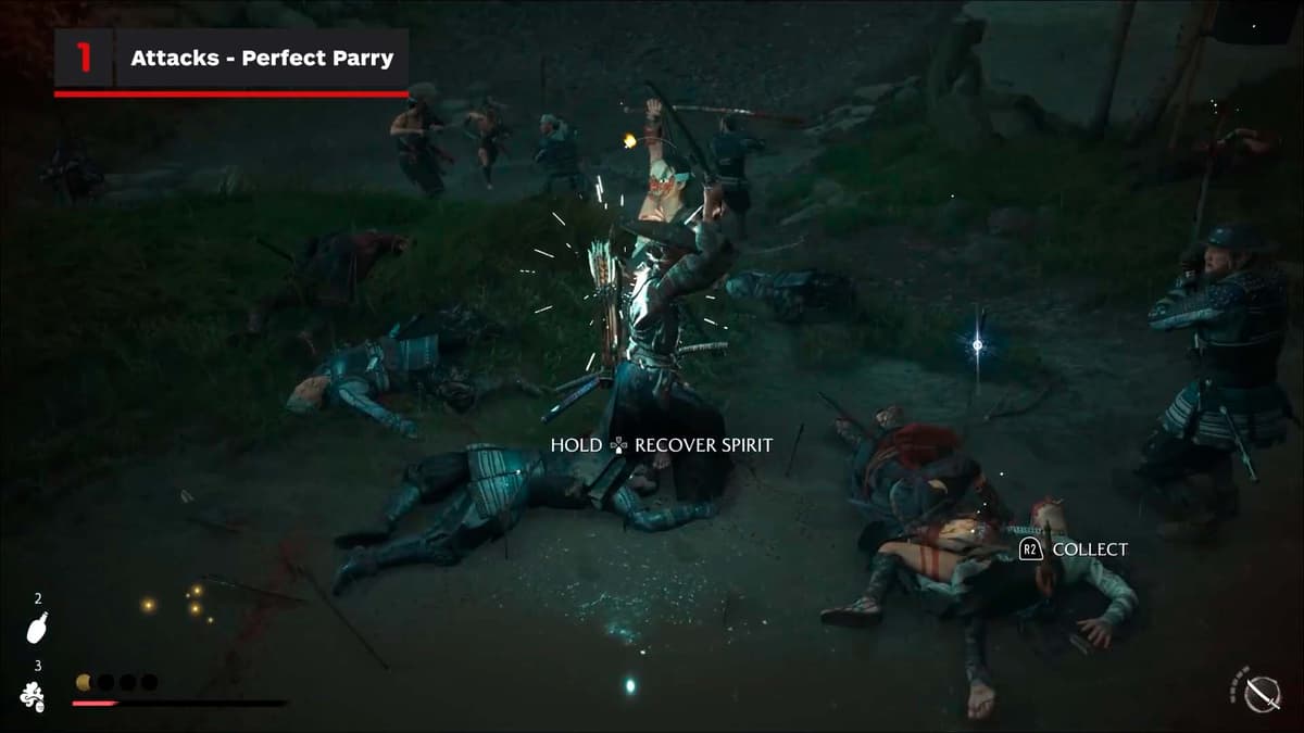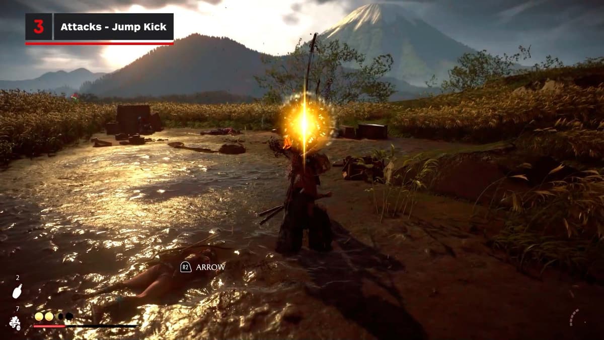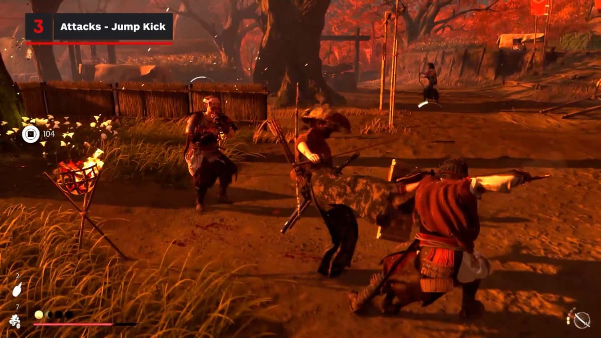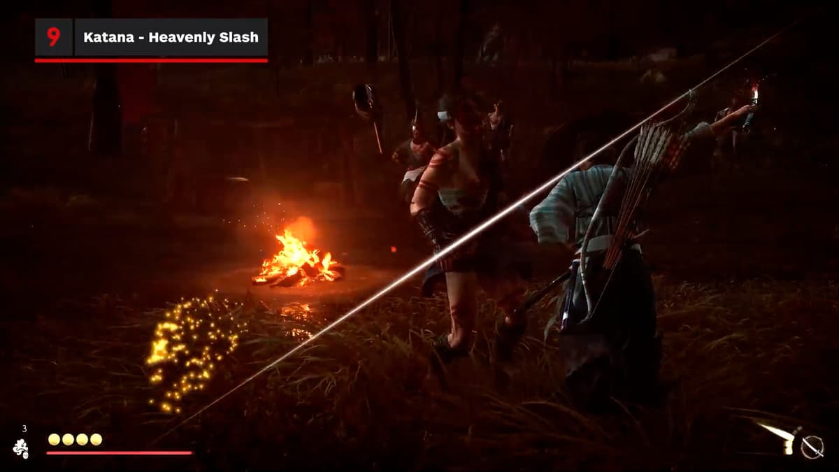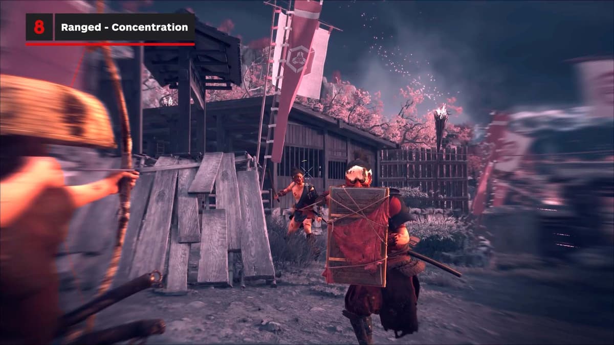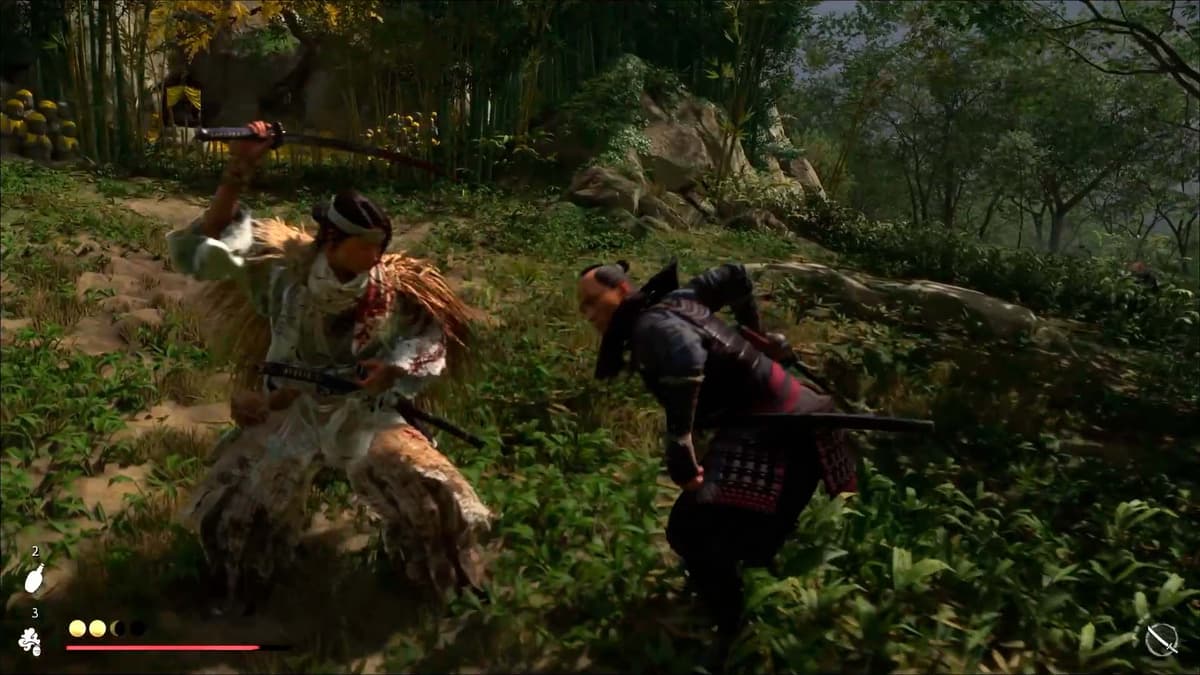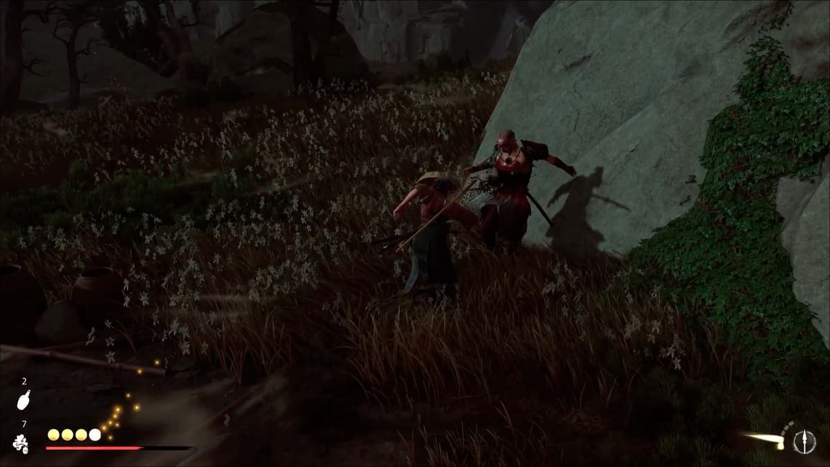 Здесь игра учит дуэлям на тяжёлых ударах. Увидел жёлтое свечение атаки у противника — нажимай тяжёлую атаку, держи и отпускай. Если зеваешь, тебя разоружают. Счётчиком разоружения позволяет делать то же самое с врагом: ловишь на тайминге, выбиваешь оружие и тут же можешь поднять и кинуть ему обратно в лицо. Приятный апгрейд ключевой механики и отличный ответ против наглых самураев.