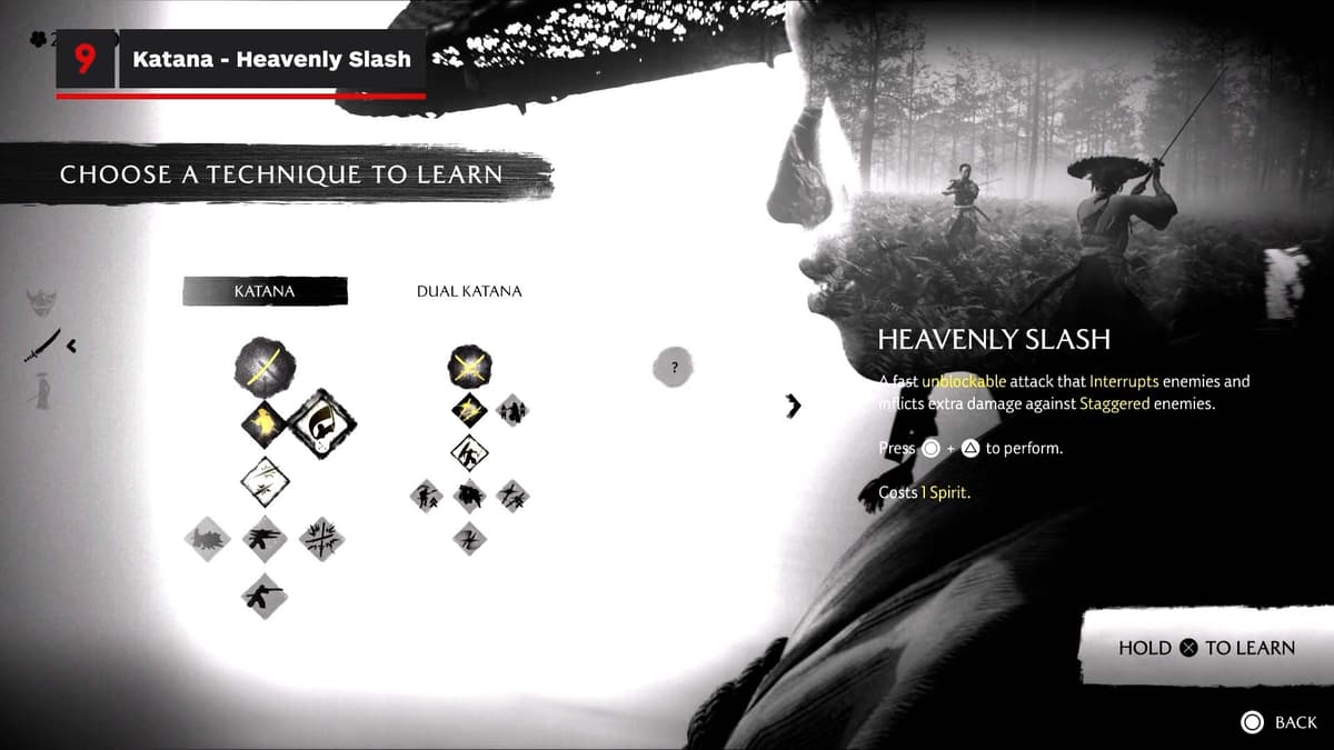 По ходу истории у тебя будет появляться разное оружие, но катана остаётся сердцем набора. Небесный удар тратит Дух, чтобы рывком прервать любую вражескую атаку — и не важно, какого размера цель.