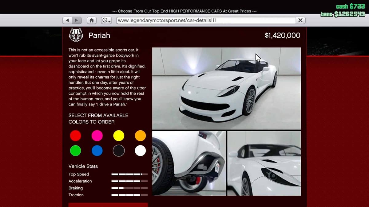 Хорошо прокачанный Ocelot Pariah оставляет большинство стандартных машин далеко позади. Купить его можно в Legendary Motorsport за 1 420 000$.