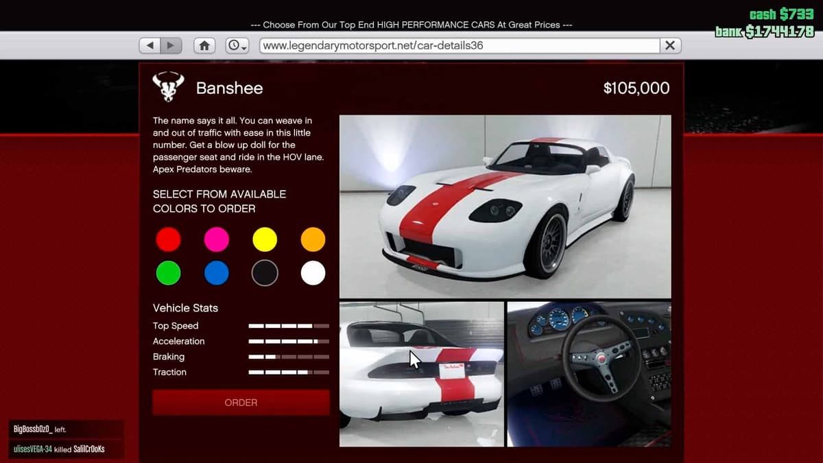 Схема простая: сначала покупаешь обычную Banshee в Legendary Motorsport за 105 000$, а потом отвозишь её в Benny’s Original Motor Works и делаешь апгрейд до 900R. Модификации обойдутся примерно в 600 000$.