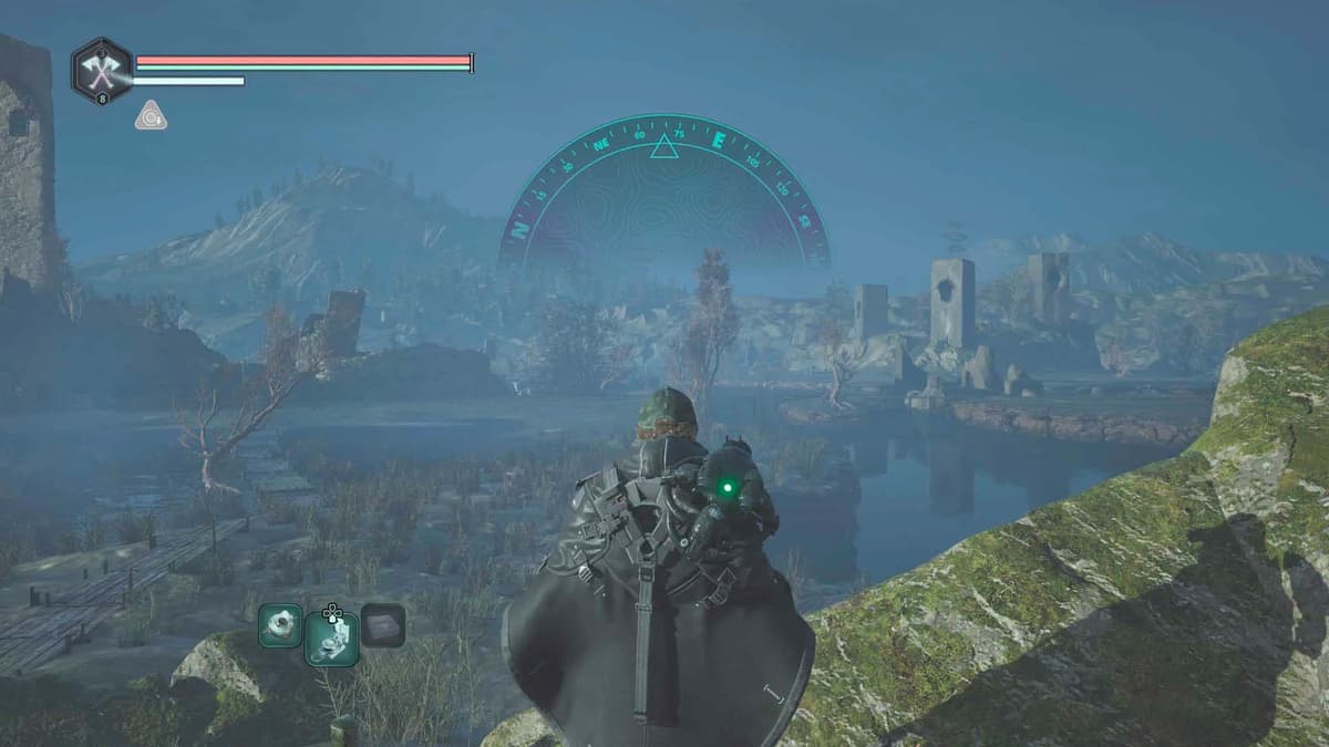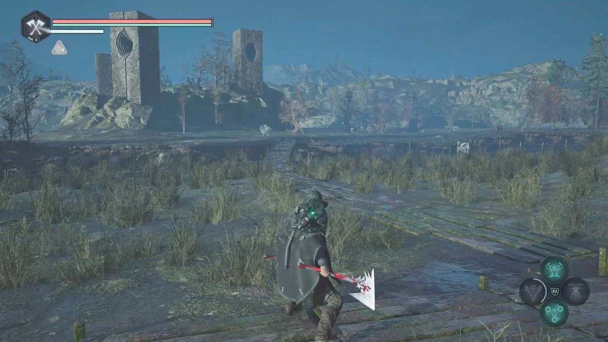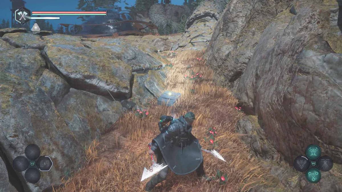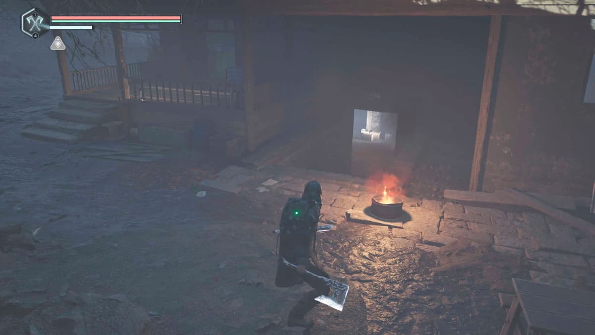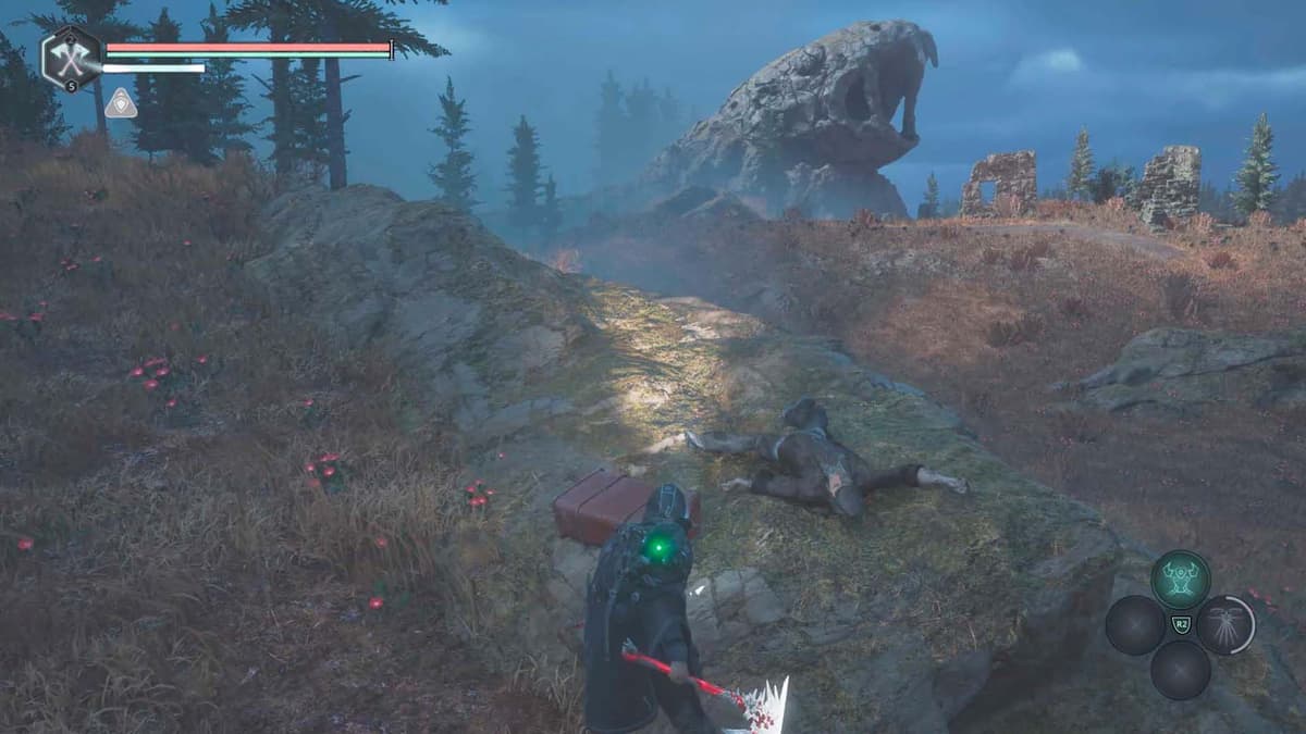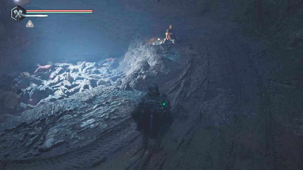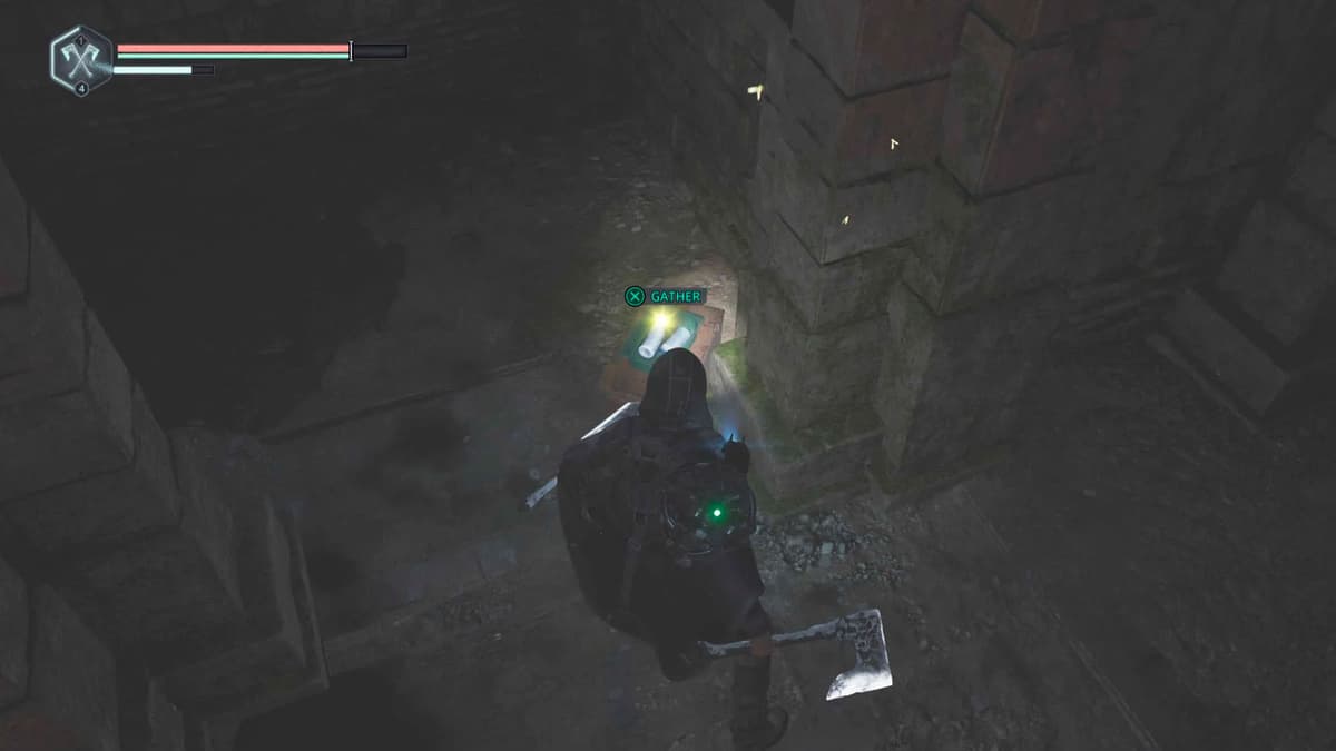 По пути загляни к костру у восточного края руин — там часто лежит расходник на лечение.