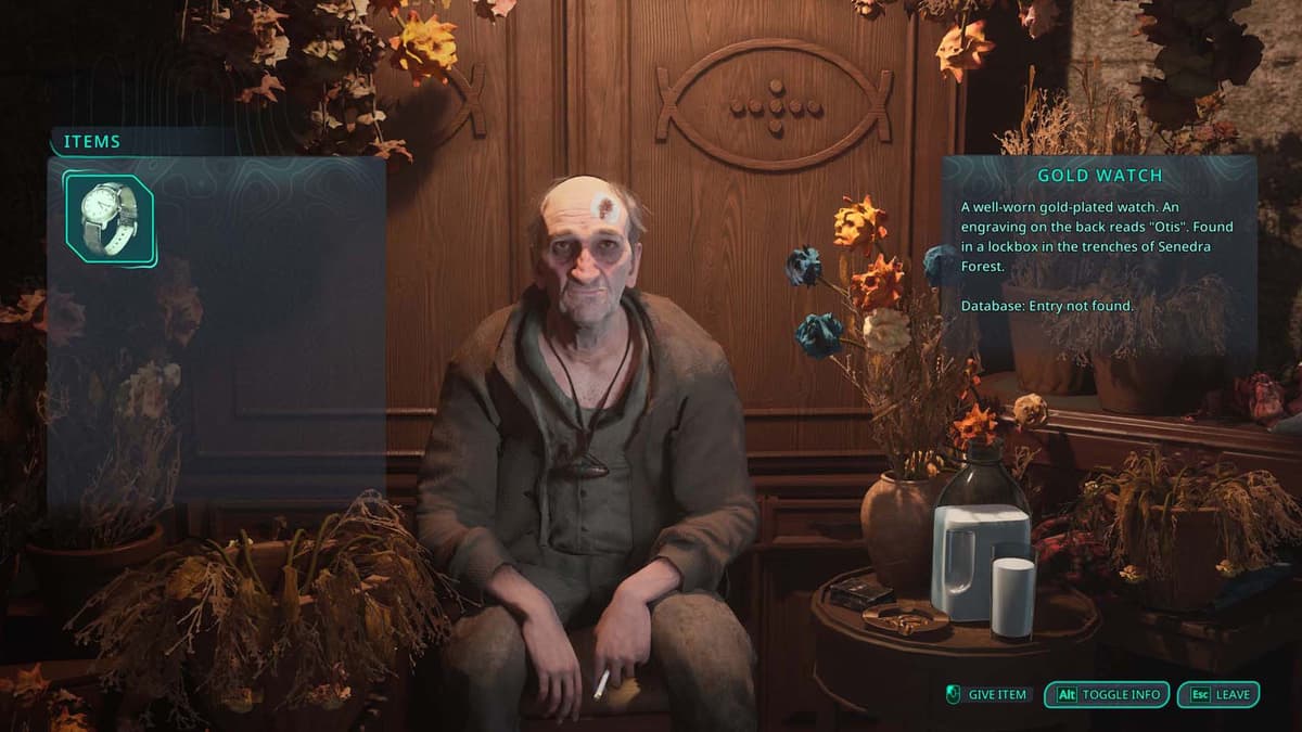 Поднимаешь находку и бежишь к Эрнесту, открывая окно «Торговля». Отдаёшь часы — дед говорит, что это фамильная реликвия: от отца — ему, от него — потомку Отису; если Аттикус объявится, достанется ему. Сам поручитель ничего материального не даёт — и это нормально: завершение фиксируется в системе, а фактическую плату забираешь у Брома. По-человечески — отличный старт: учишься читать намёки и не требовать «лут» прямо здесь и сейчас.