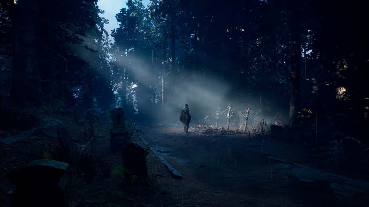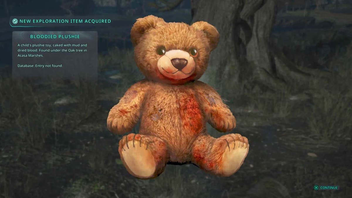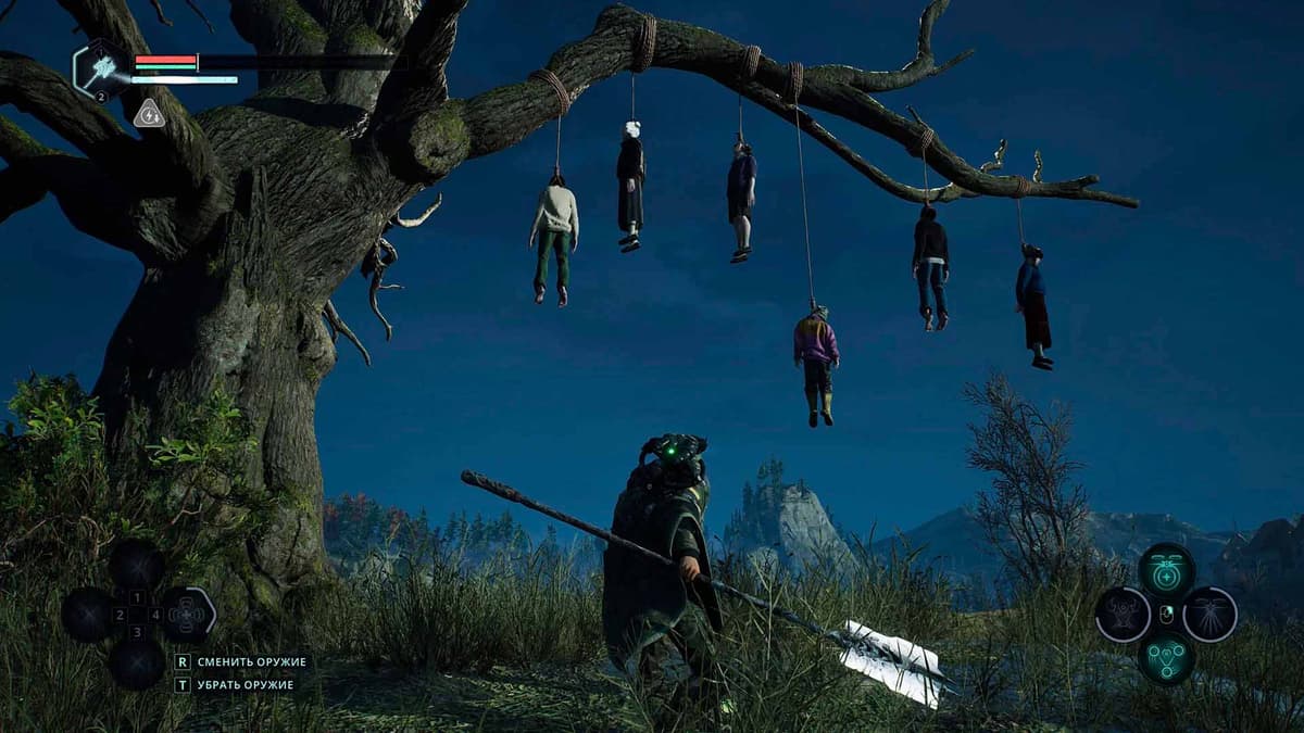 У дерева с повешенными, прямо под телом ребёнка, мигает нужный интерактивчик — «Кровавый плюш». Старайся не шуметь: в болотине слышат шаги сильнее обычного, а бои в трясине неприятнее из-за ограниченного пространства.