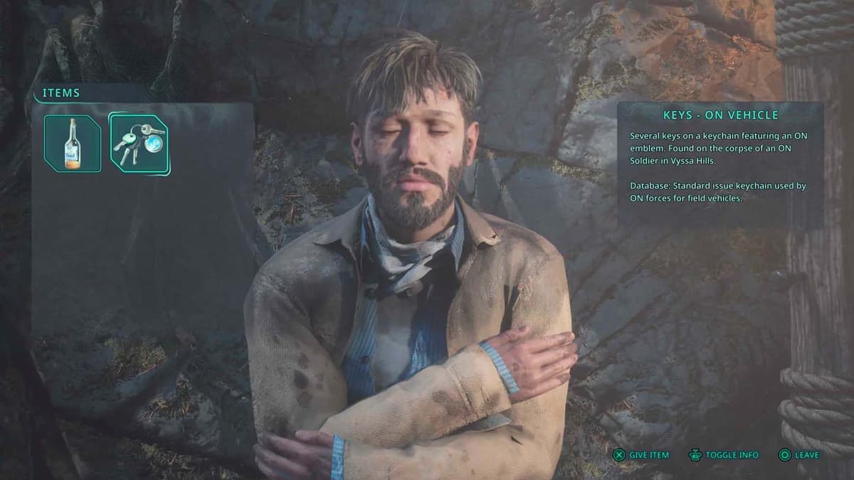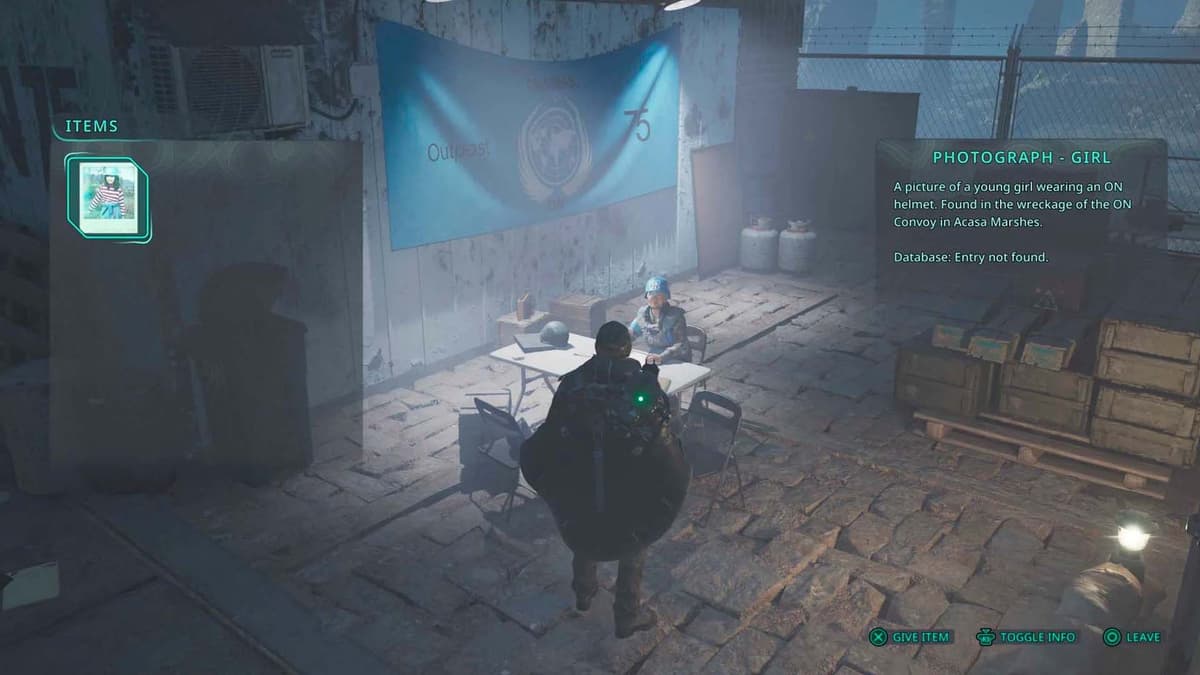 Эта нить раскроется только после первой главы, когда Йова чуть опустеет и патрулей станет меньше. Следуй к кузнице в Акаса Маршес и подальше — к северо-восточной кромке трясин. Там у стола под флагом ON сидит лейтенант Зао Ру. Она – офицер, что была с Виктором в разбитом конвое. Заговори: Ру поблагодарит за спасение, а потом вспомнит, что хранила фотографию дочери в потайном отсеке внутри конвоя.