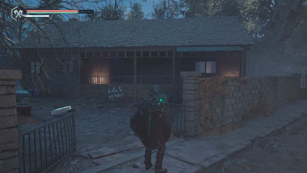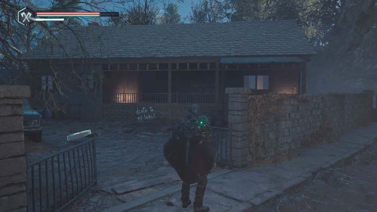 Дом на западе Йовы с граффити про «Сабс» у крыльца; рядом точка сохранения. Внутри — пьяный мужчина, который монотонно проклинает прошлое и вспоминает сына. Поговори с персонажем, затем посмотри на рамку с фотографией прямо перед ним — так задача и запускается.