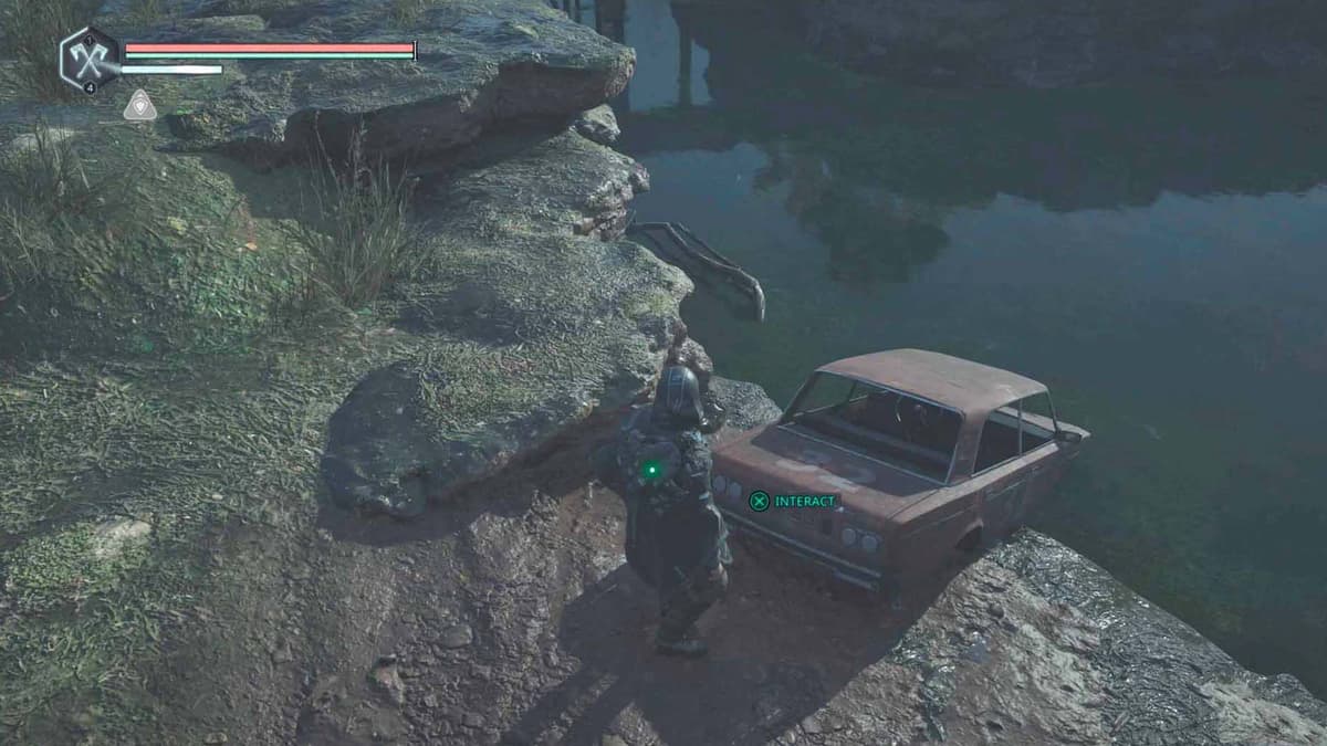 Цель – найти тот автомобиль, который этот ключ открывает. Учитывай направление на северо-восток от кузницы к руинам; ориентир — всё тот же дуб с висельниками между востоком и юго-востоком от города. Не доходя до древа, смотри левее: в водной глади рядом с маленькими развалинами торчит «утонувшая» машина, носом в трясину. Крышка багажника слегка подсвечена, взаимодействуешь — и ключик встаёт в замок.