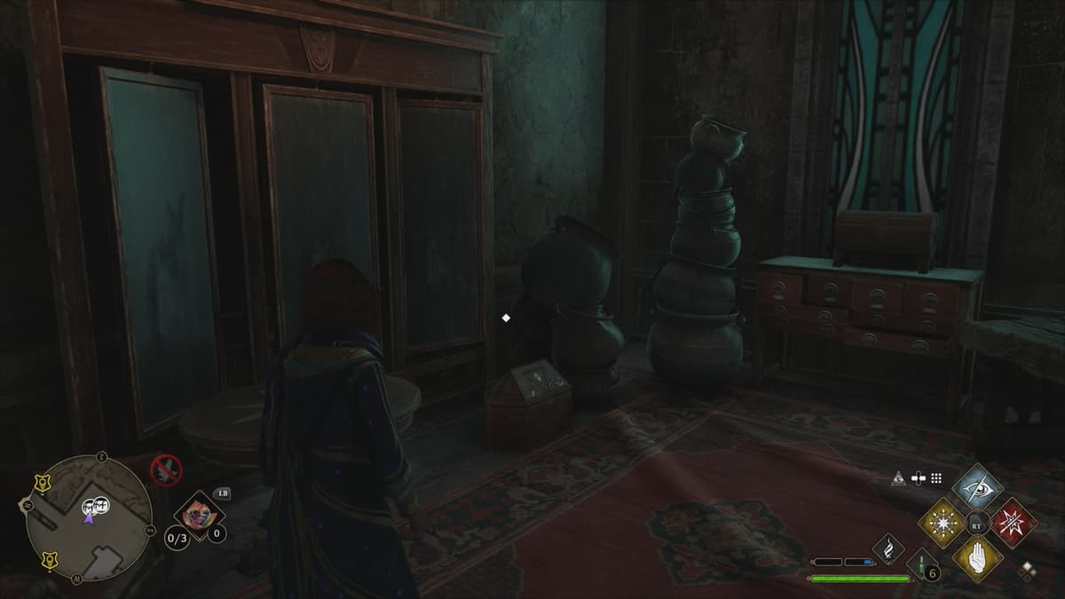 Перед входом накинь Дезиллюминационное заклинание: в комнате стоит Сундук с глазом, и он открывается только когда ты под маскировкой. Внутри — 500 галлеонов.