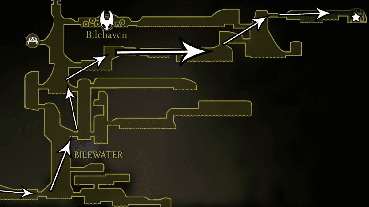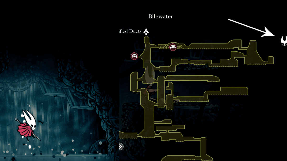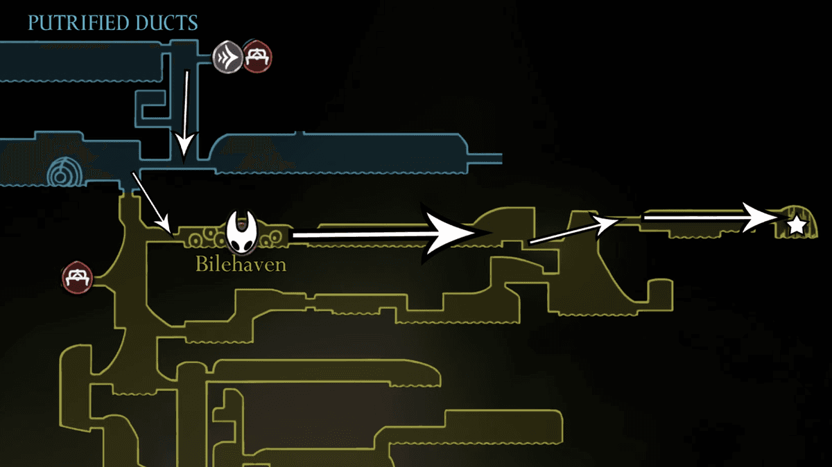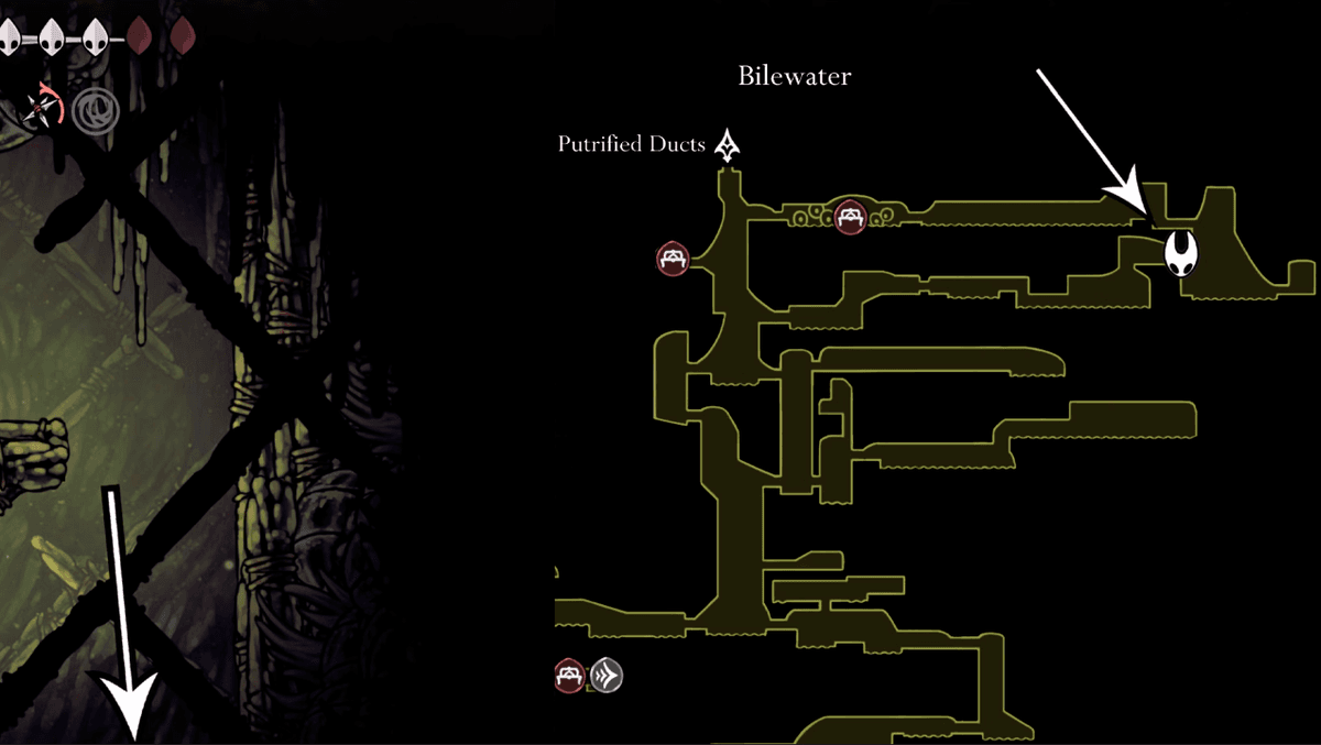 Когда соберёшь все карты, нужно будет найти Шакру по следу из колец. Добраться до неё можно двумя путями. Если ты уже убил Гроала в Желчноводье, спускайся вниз от станции фаст-тревела в Гнилых Стоках, оттуда — ещё ниже и направо, как на схеме. Пройди через арену Гроала и продолжай бежать до большой комнаты справа. В конце пути ты найдёшь кольцо — взаимодействуй с ним, чтобы увидеть след Шакры.