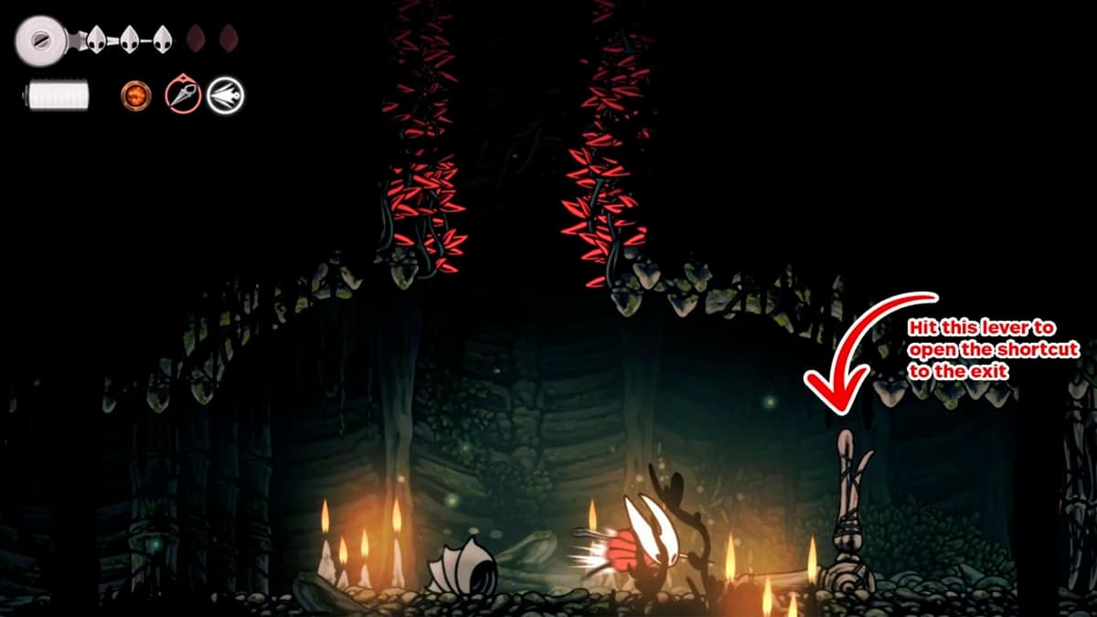 Внизу справа увидишь рычаг и запертую дверь. Ударь по рычагу — откроется короткий путь к выходу из Капеллы. Если погибнешь у босса, вернёшься сюда гораздо быстрее.