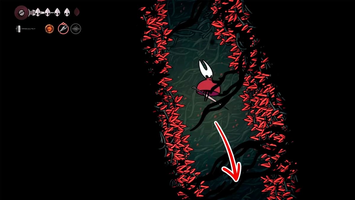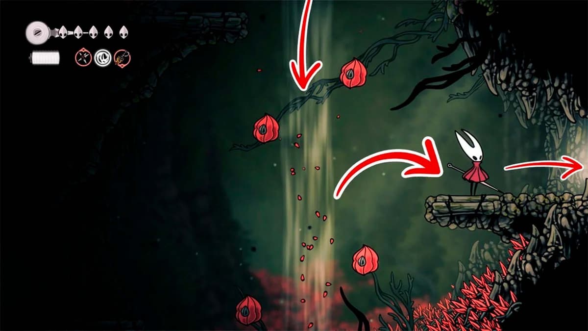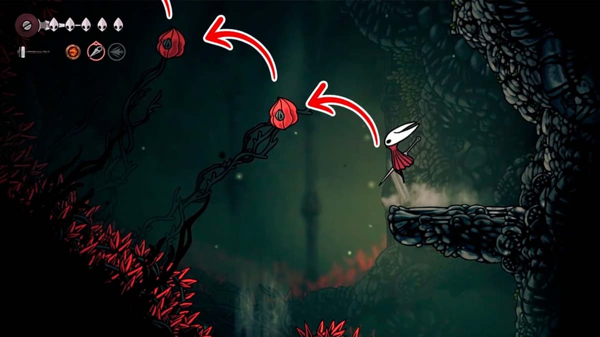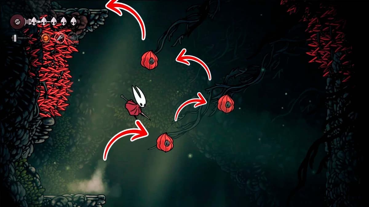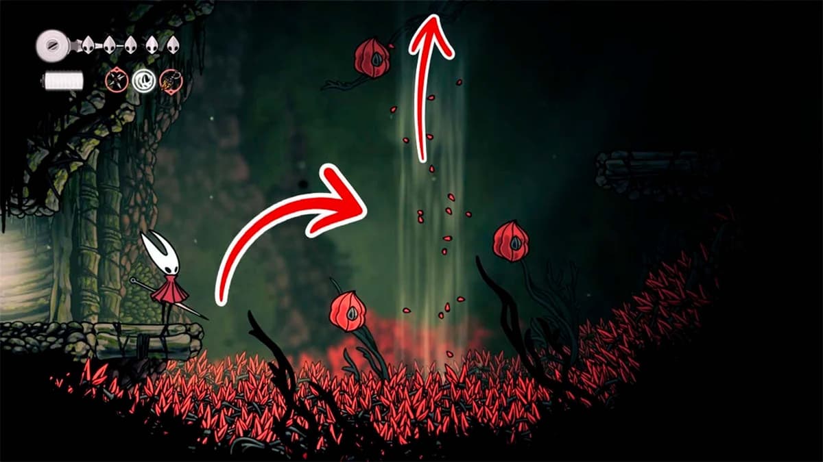 На развилке вверху поворачивай направо. Впереди — яма с шипами и три красных семенных капсулы. Твоя задача — пого-удары по ним: в прыжке держи стик/клавишу вниз, жми атаку и трижды подряд оттолкнись от капсул. В конце поднимайся потоком воздуха.