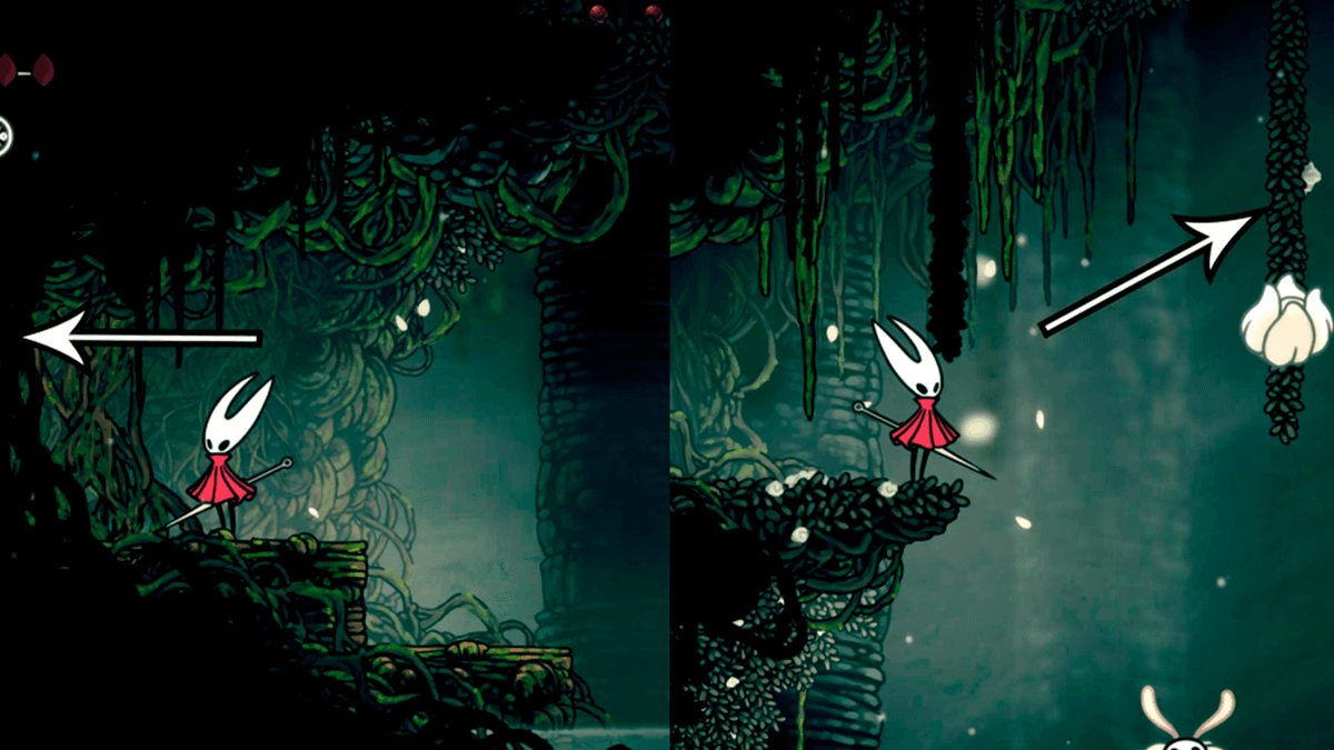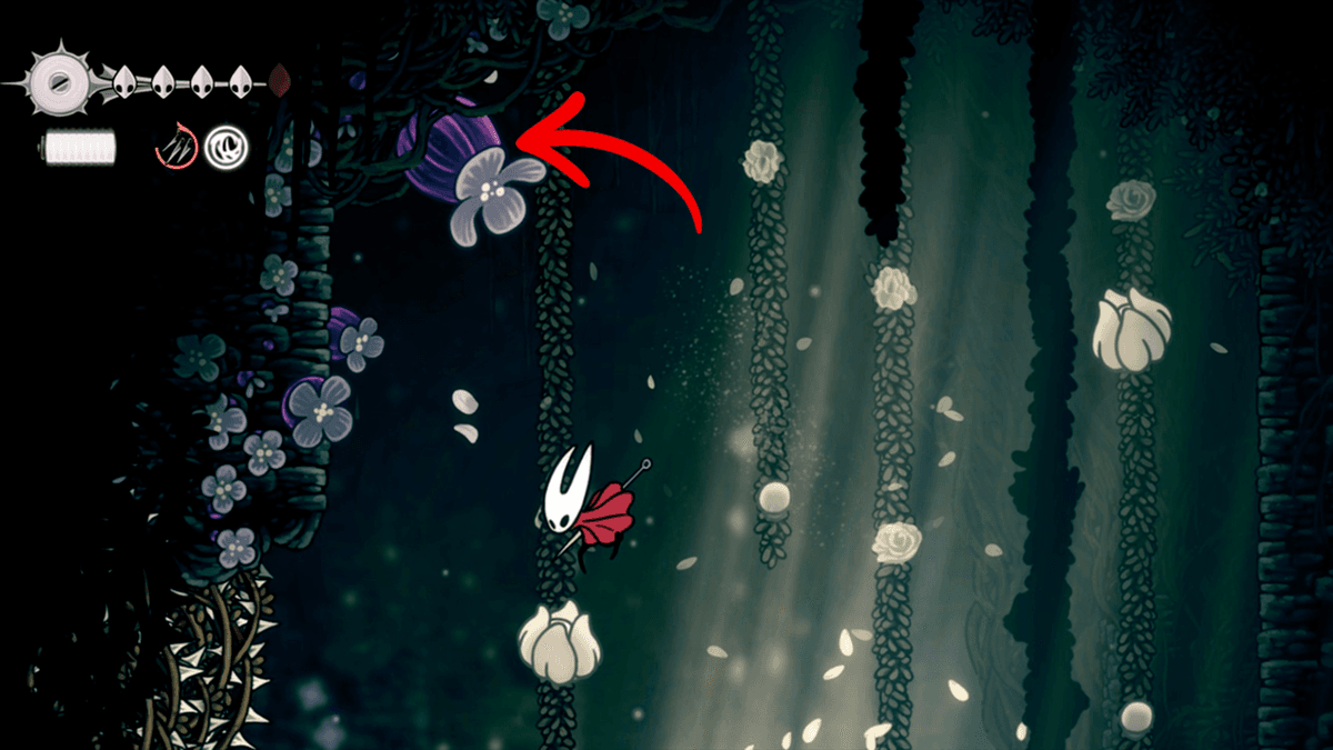 После битвы иди влево и спрыгни в следующий комнату с дырой в полу. Под ней ты увидишь белые цветы для прыжков и ту самую розовую поросль. Аккуратно упади в дыру и сместись влево, чтобы добраться до большого цветка с Сердцем поллипа.