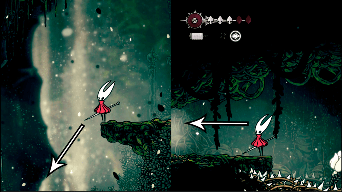 После этого сразу иди вправо и поднимайся по стене в следующую комнату. Заберись по первой же скале до самового верха, а затем прыгни влево и упади в воду. Уничтожь розовый улей, чтобы открыть проход. Залезь в «помещение» слева, спрыгни вниз и перемахни через пропасть справа, чтобы добраться до очередного сердца.