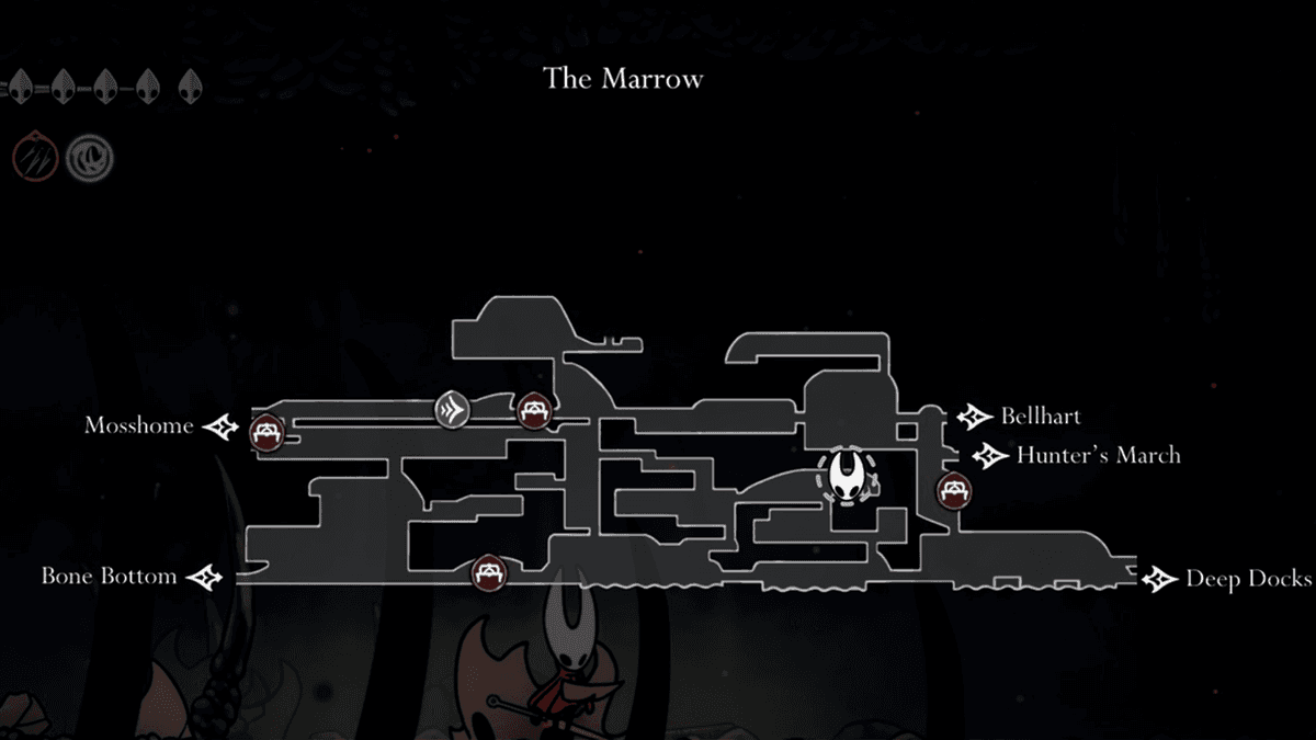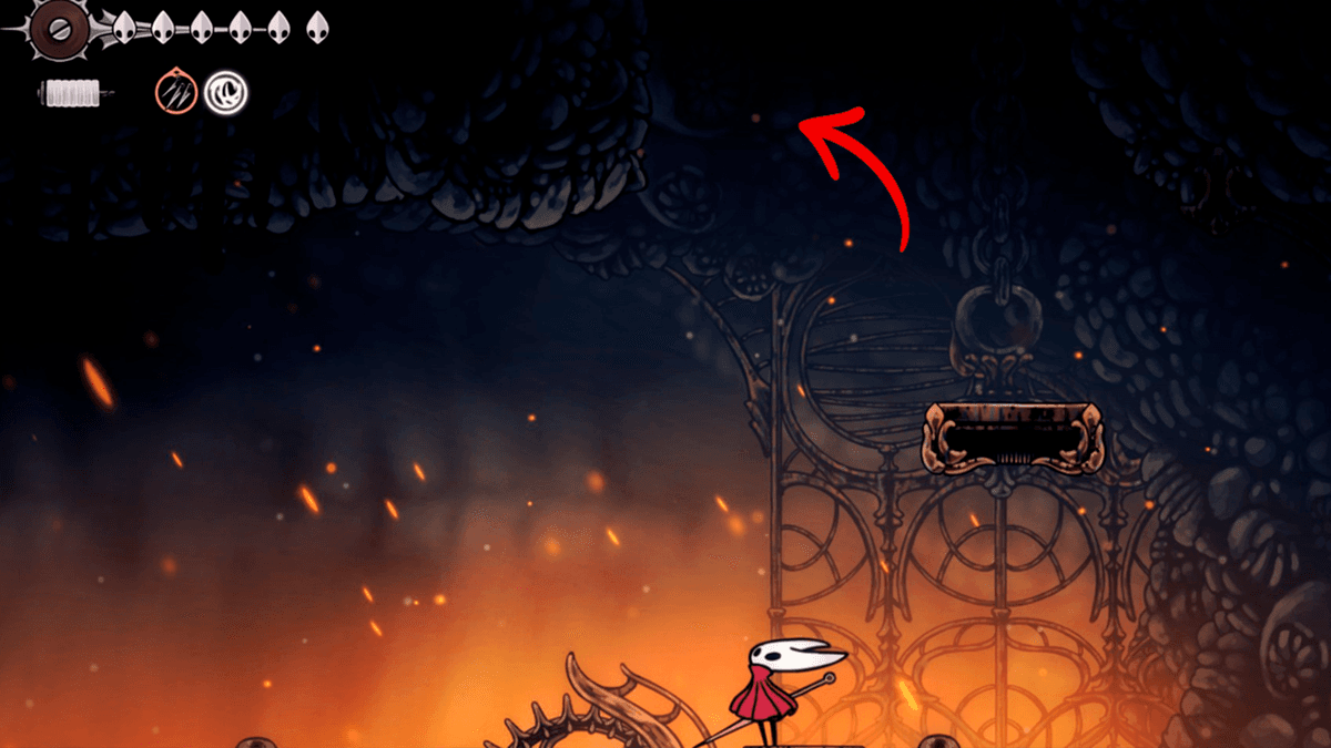 Залезай выше, продвинься чуть левее, а затем перемахни направо над шипами. Там придётся разбить хрупкую стену, чтобы открыть проход в следующую комнату. В ней можешь сначала сходить направо и подобрать Шёлк, а затем вернись налево и запрыгни выше по платформам. Наверху ты найдёшь гигантский череп — ударь по нему, чтобы призвать босса.