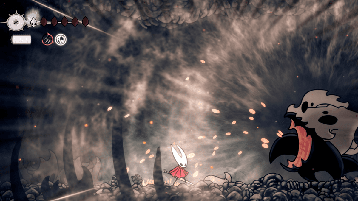 Иногда он прыгает на месте или прямо на Хорнет, вызывая камнепад — аккуратно уворачивайся от булыжников, пока не окажешься в безопасности.