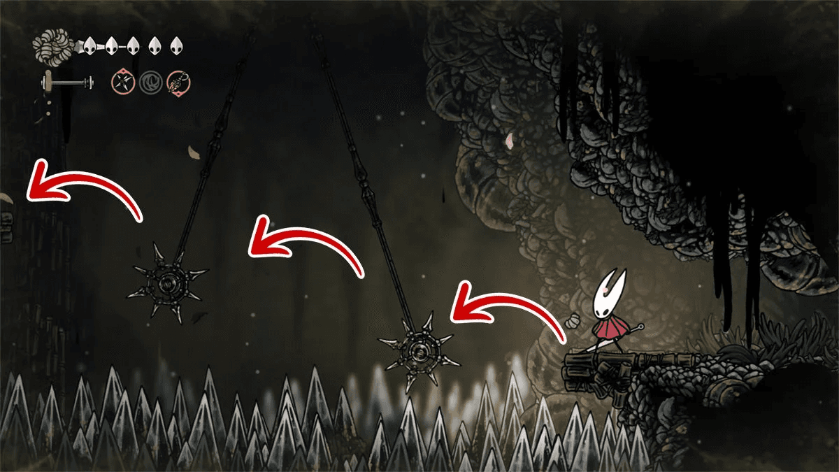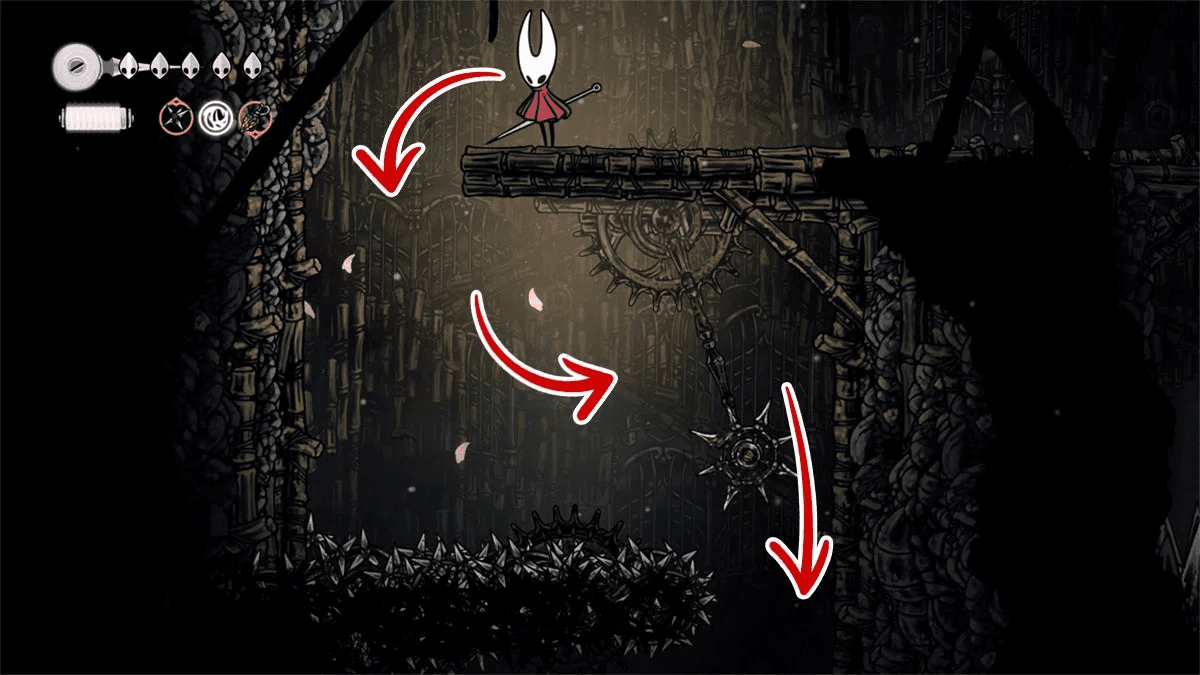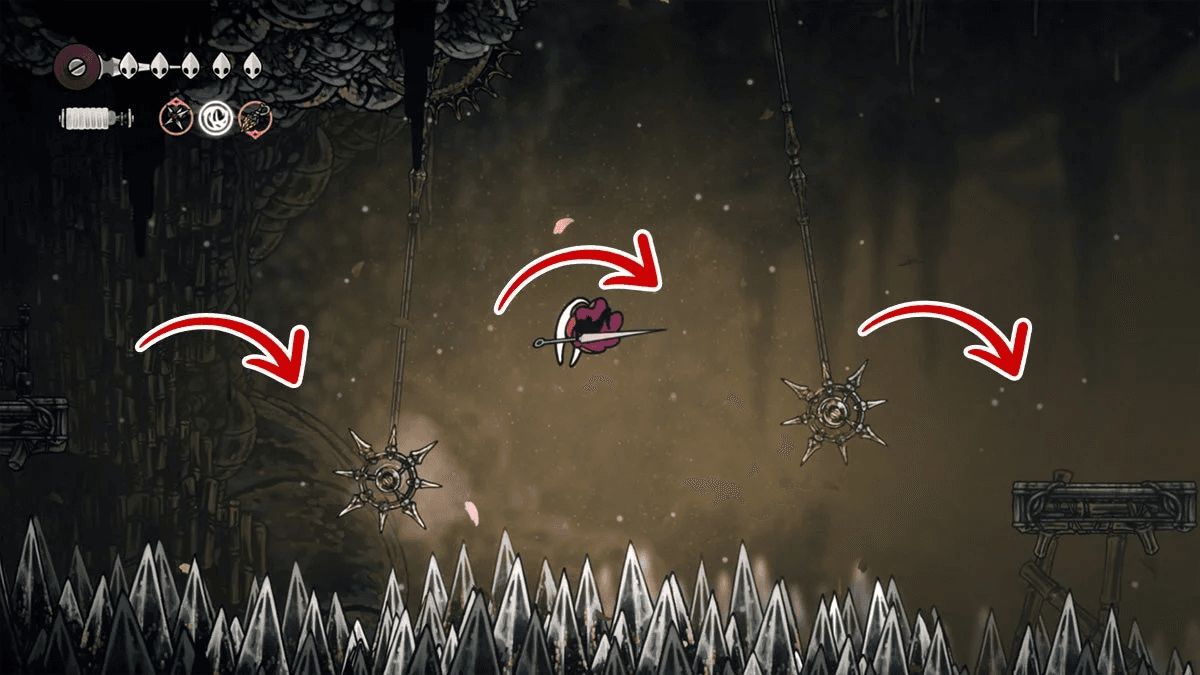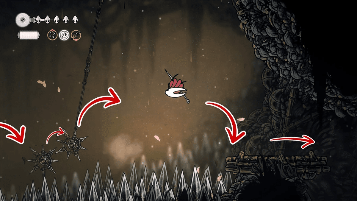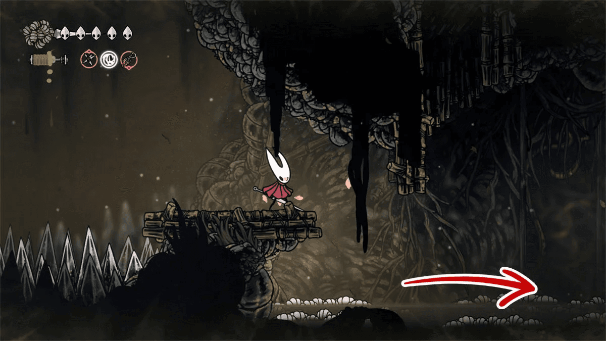 Чтобы открыть возможность сохраняться и восстанавливаться у этого «костра», нужно прорваться в скрытую комнату слева от неё. Для этого заберись на уступ и разбей ближайшую стену. Затем продвинься влево и прорвись через платформинговую секцию над шипами. В конце тебя будут ждать катушки с Шёлком, чтобы ты мог вылечиться от только что пережитого.
