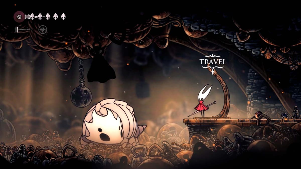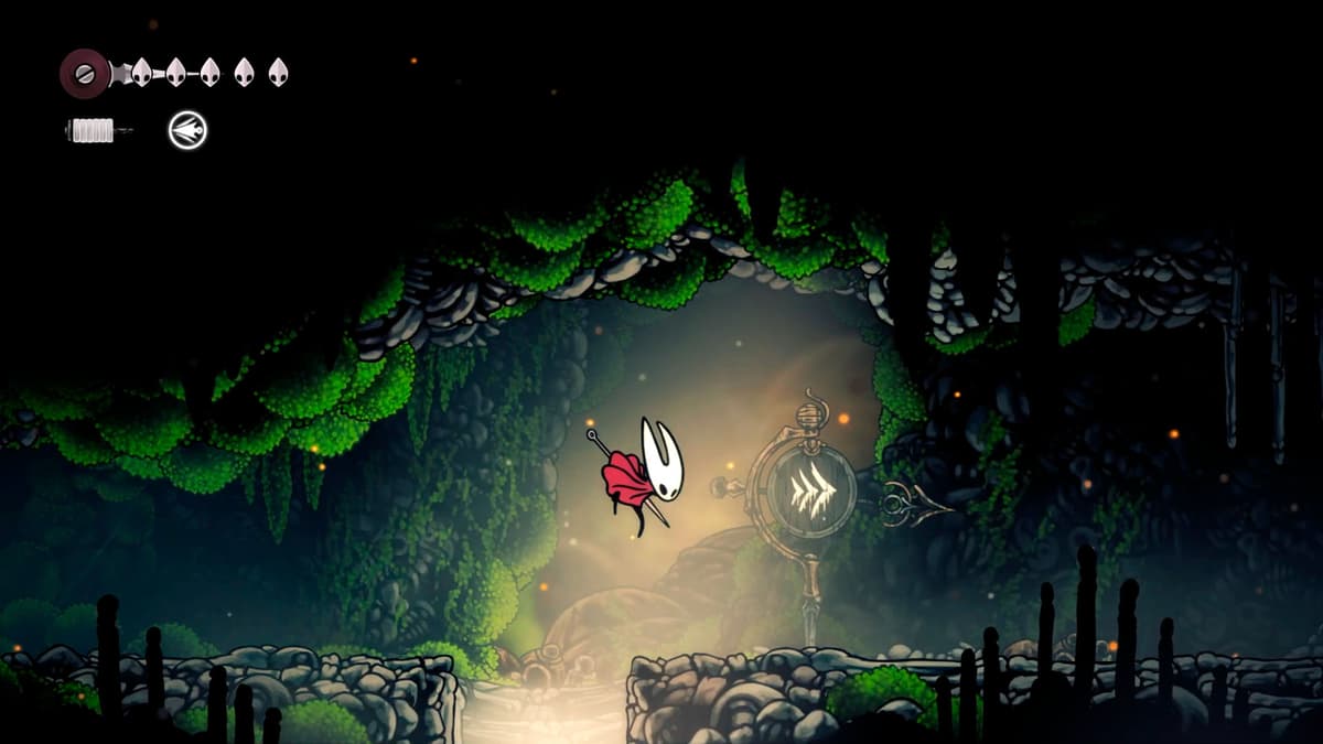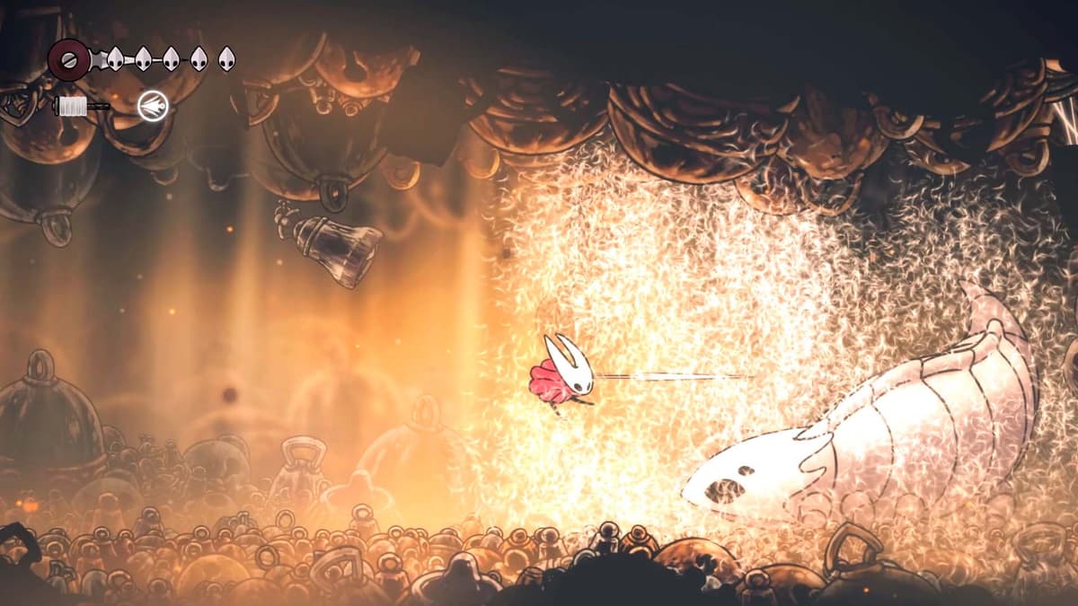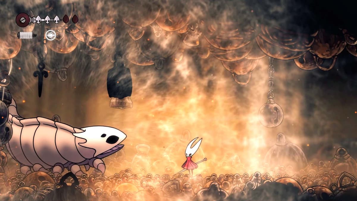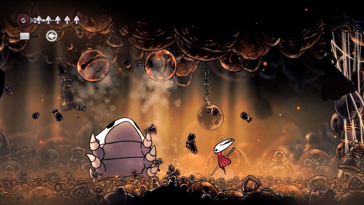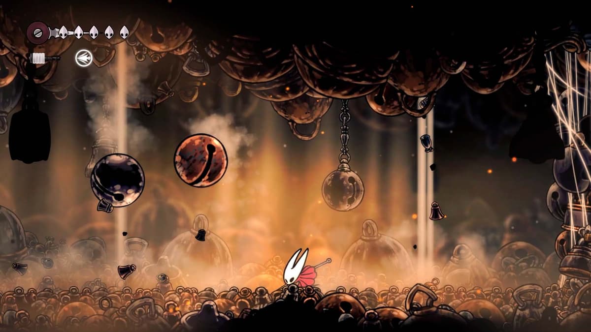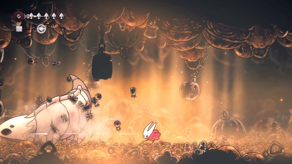 Хорнет не добивает противника — Bell Beast отступает. Здесь остаётся первый Silk Heart: он автоматически восполняет одну катушку шёлка, когда запас опустеет до нуля. Это комфортный буст выживаемости в ранней игре и прямая мотивация чаще пользоваться копьем и активными умениями: вероятность оказаться вовсе без шёлка заметно снижается.