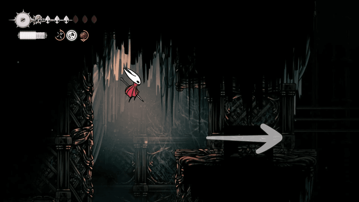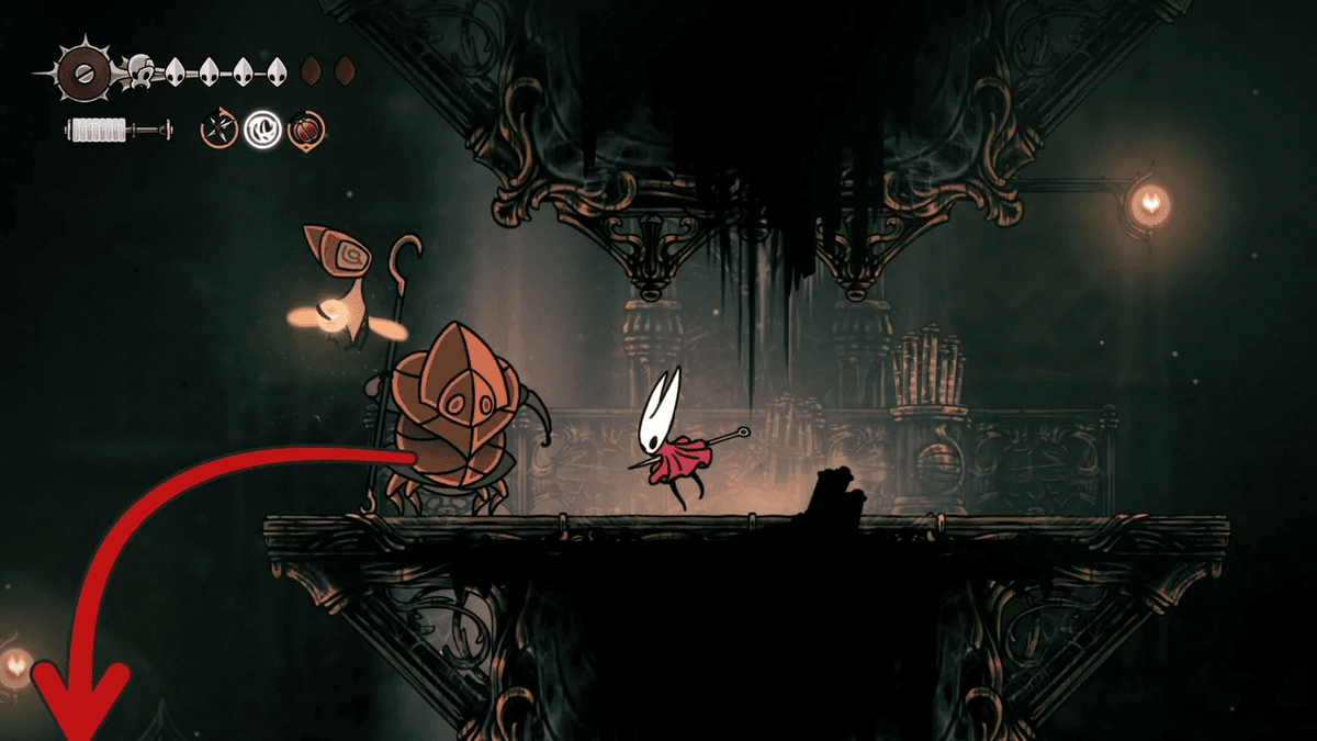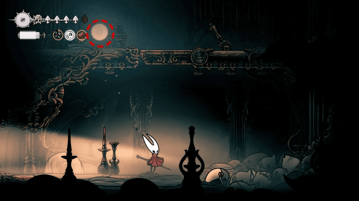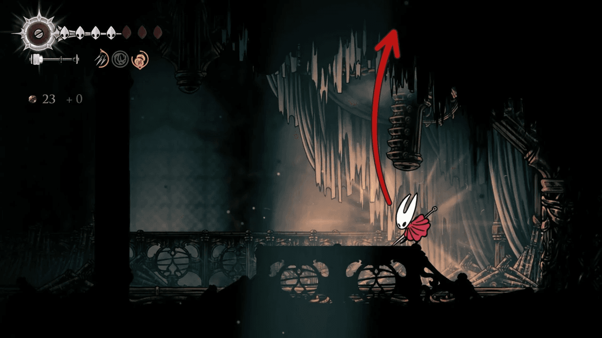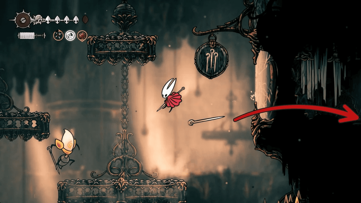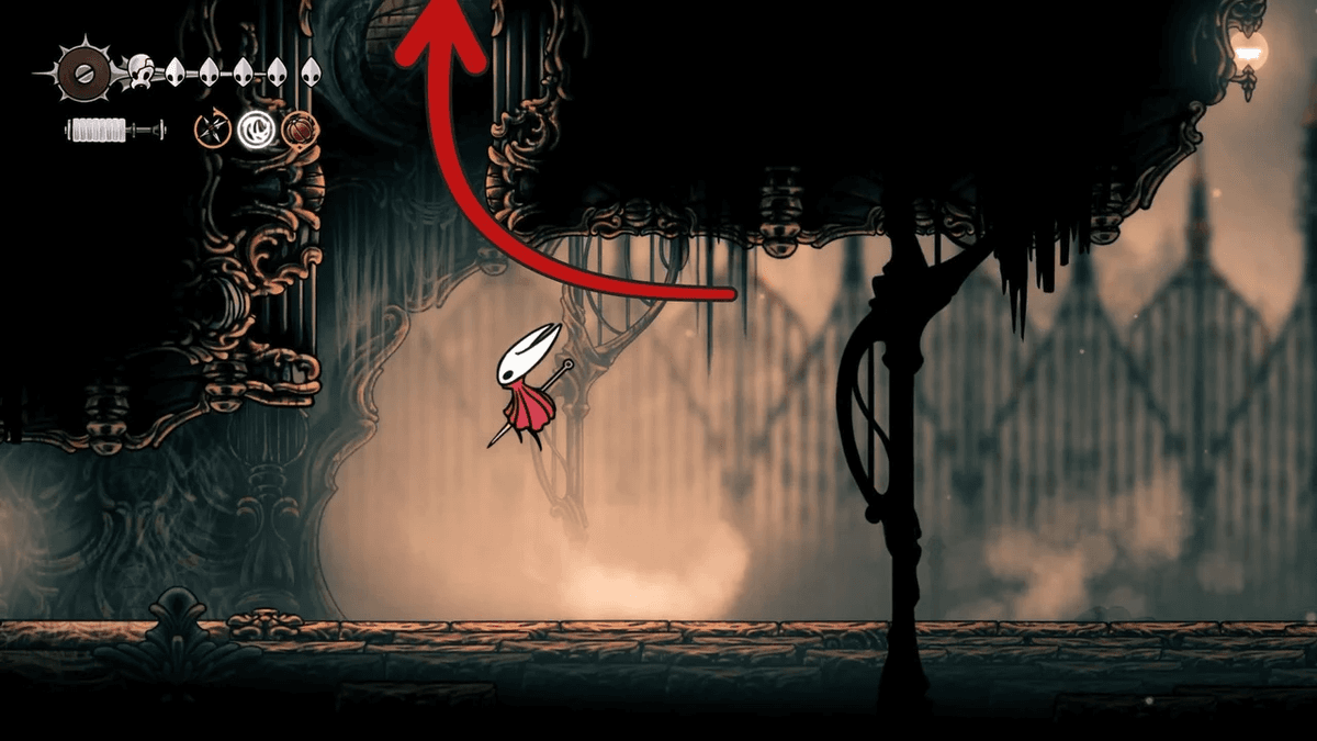 Для начала разблокируй Отскок от стены — его можно получить после победы над Сестрой Лучиной в Панцирном Лесу. После этого тебе придётся снять проклятие с жителей Звонвилля. Иди вправо от битвы с Лучиной, пока не дойдёшь до сегмента с платформой — ты уже был здесь, когда шёл к боссу, но на этот раз поднимайся направо по стене с помощью новой абилки. Здесь ты найдёшь секретный туннель, спрятанный за кучей колоколов.