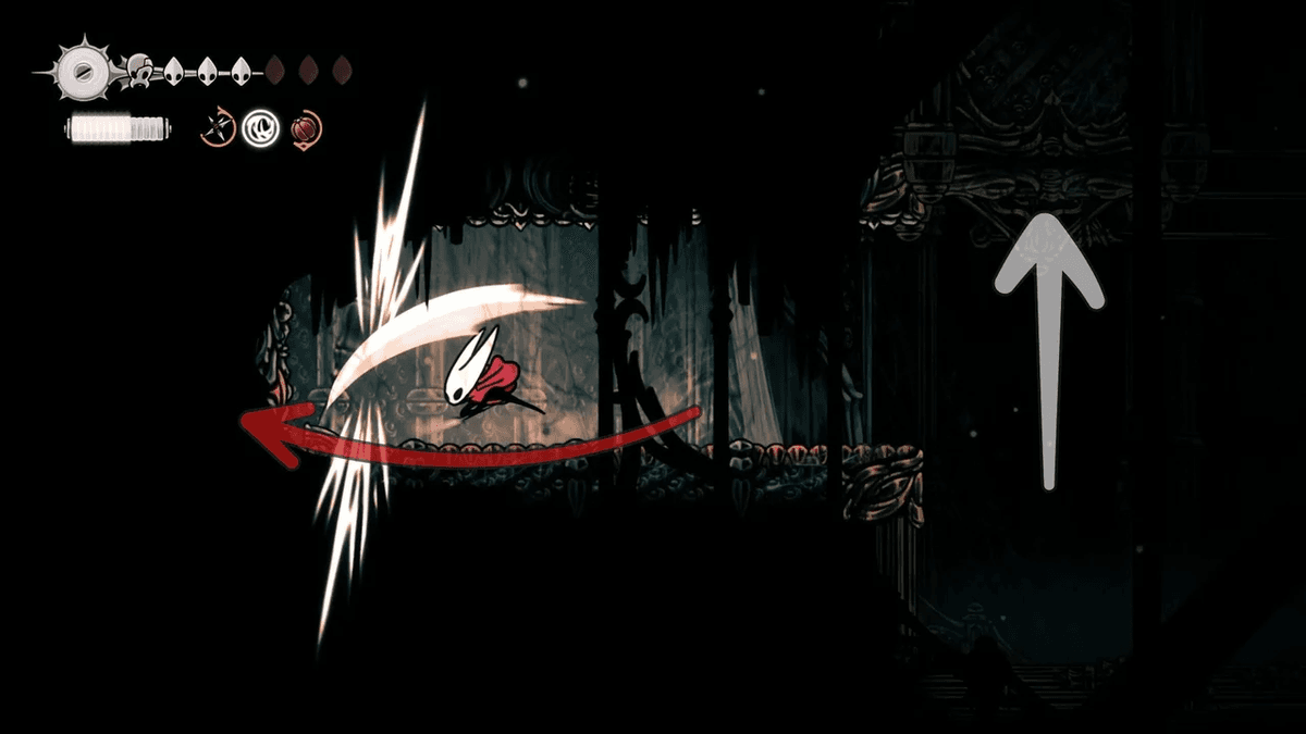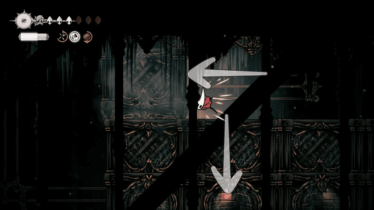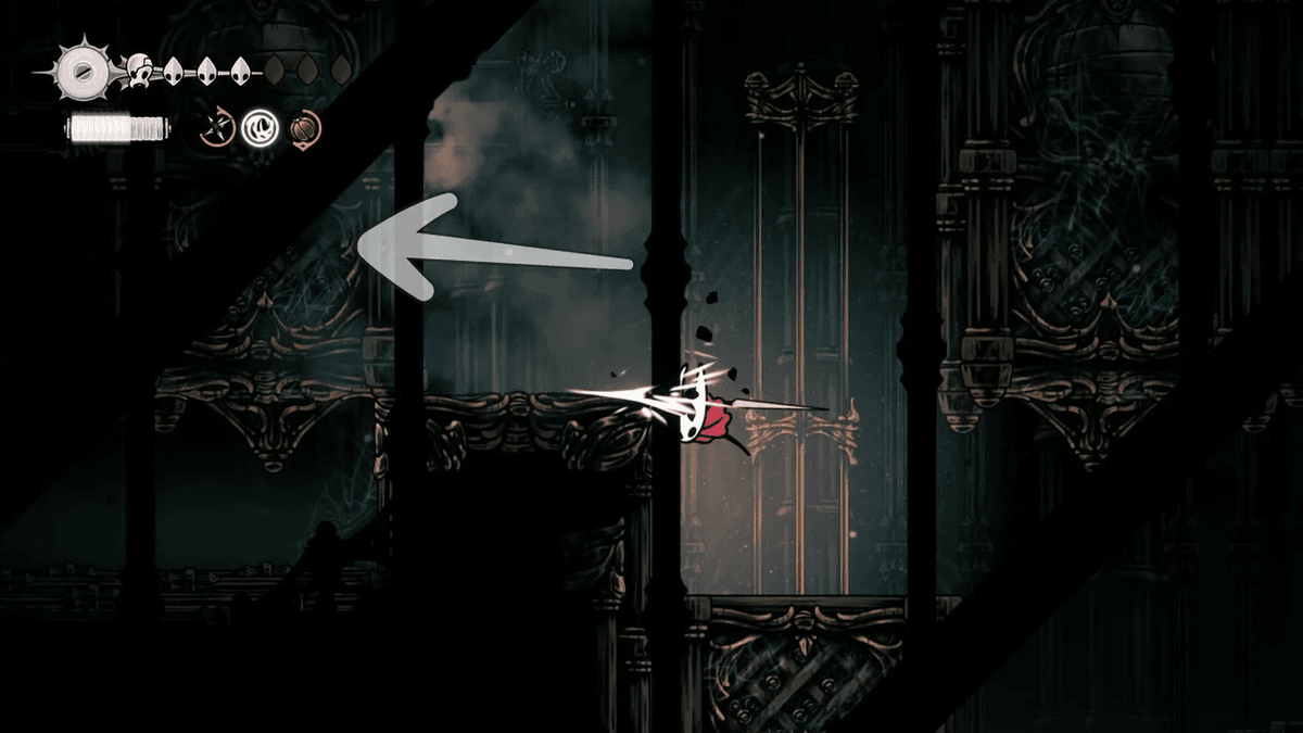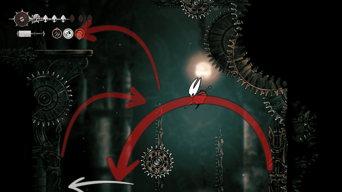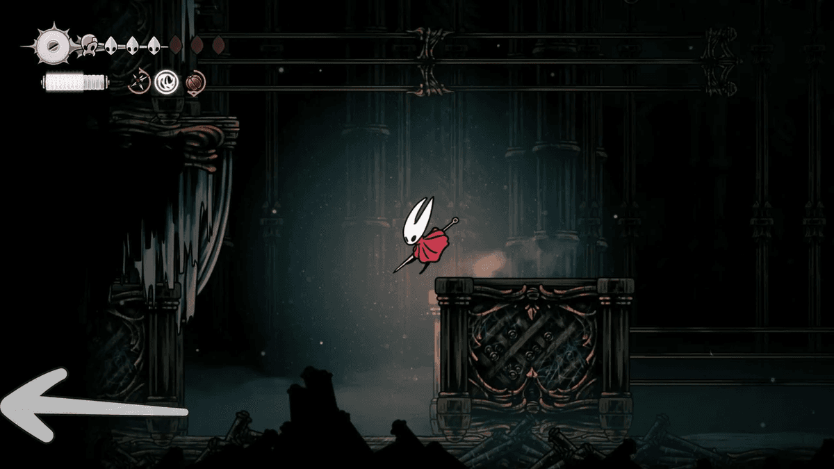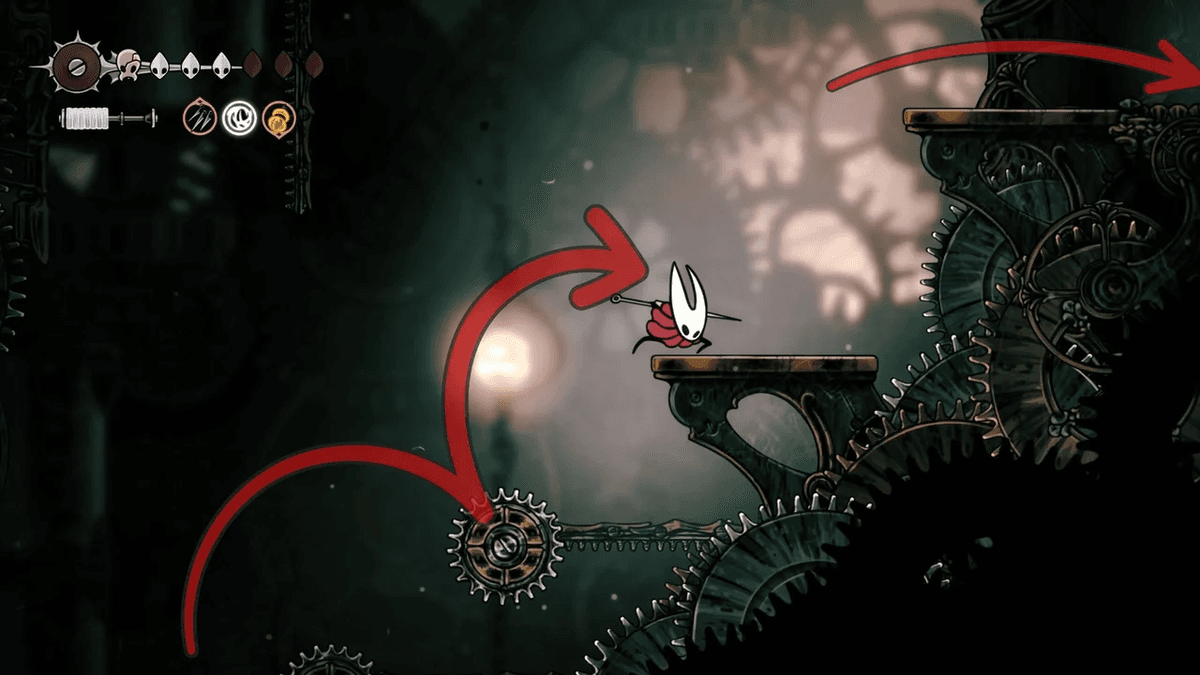 Для начала разблокируй Отскок от стены — его можно получить после победы над Сестрой Лучиной в Панцирном Лесу. После этого тебе придётся снять проклятие с жителей Звонвилля. Иди вправо от битвы с Лучиной, пока не дойдёшь до сегмента с платформой — ты уже был здесь, когда шёл к боссу, но на этот раз поднимайся направо по стене с помощью новой абилки. Здесь ты найдёшь секретный туннель, спрятанный за кучей колоколов.