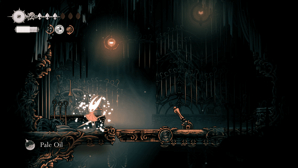 Заветное масло находится на втором этаже. Чтобы туда попасть, придётся зайти с другой стороны. Для начала отдохни на скамейке в святилище неподалёку, а потом отправляйся налево в Механическое ядро. Спускайся вниз и иди направо — здесь придётся пропрыгать по шестерням, чтобы добраться до нужной двери. Так ты попадёшь в новую локацию, где и скрыт проход в лавку.