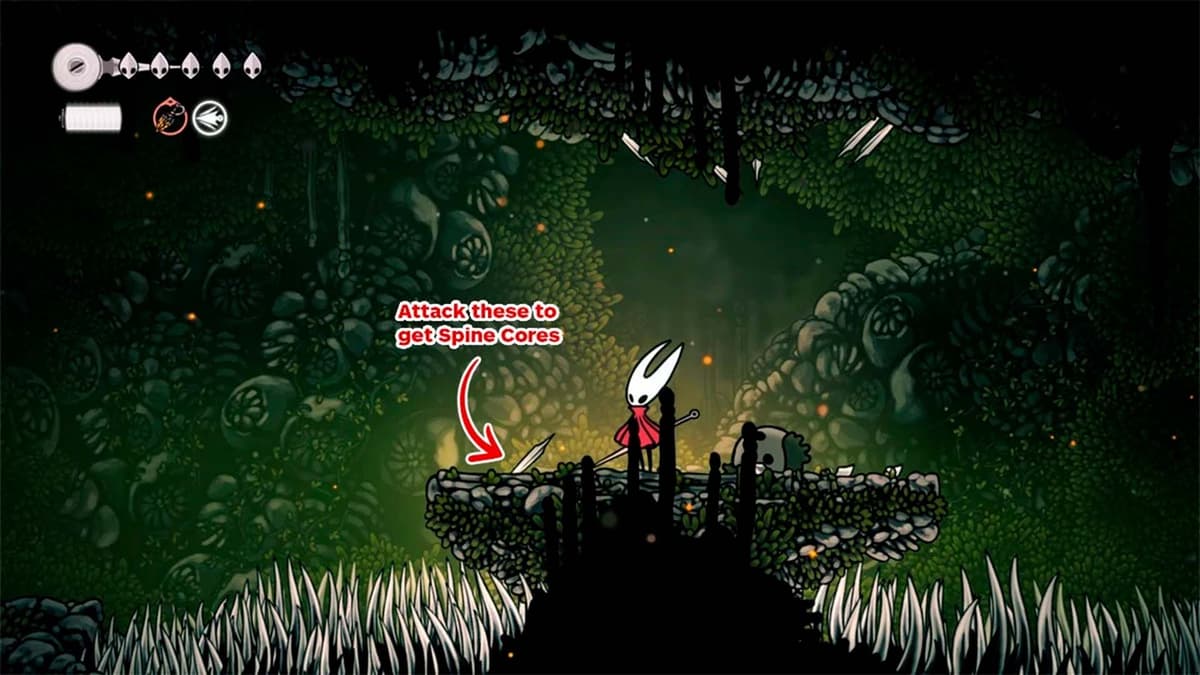 Не убивай Hoker сразу. Ударь один раз — он выпустит 4 белых шпиля, они воткнутся в землю/стены. Бей каждый шип, чтобы получить Spine Core.