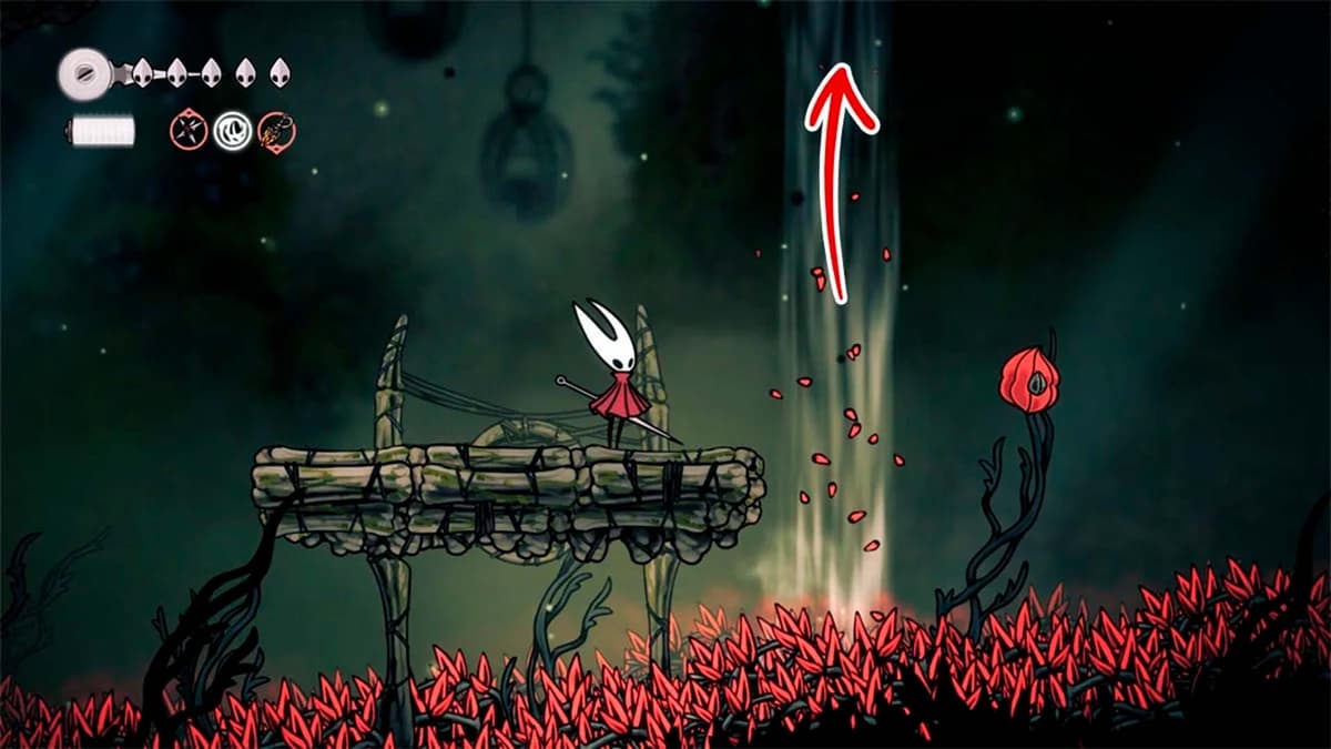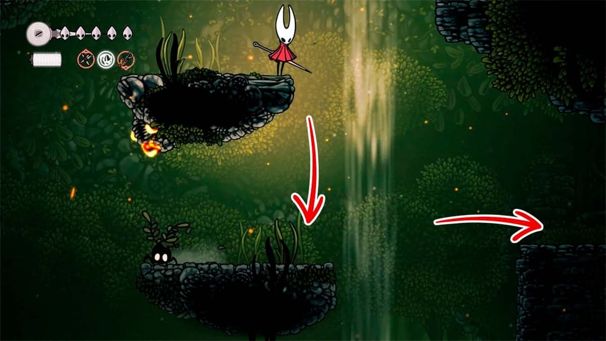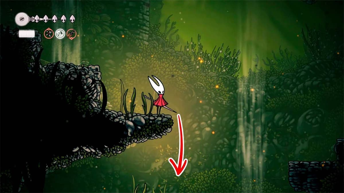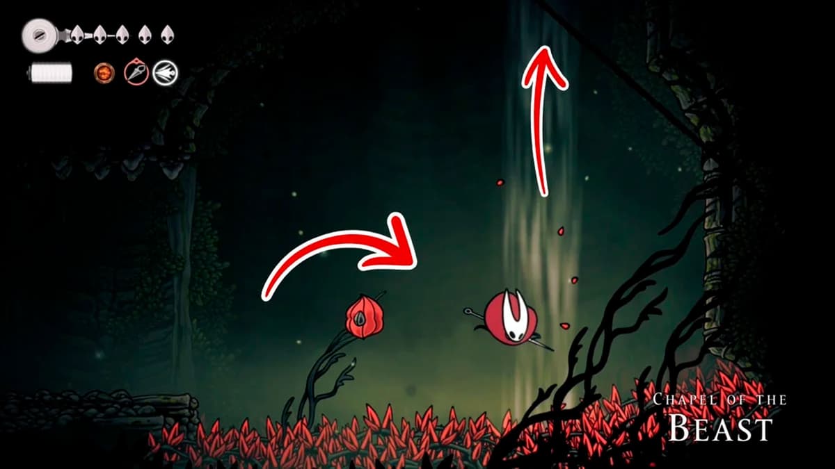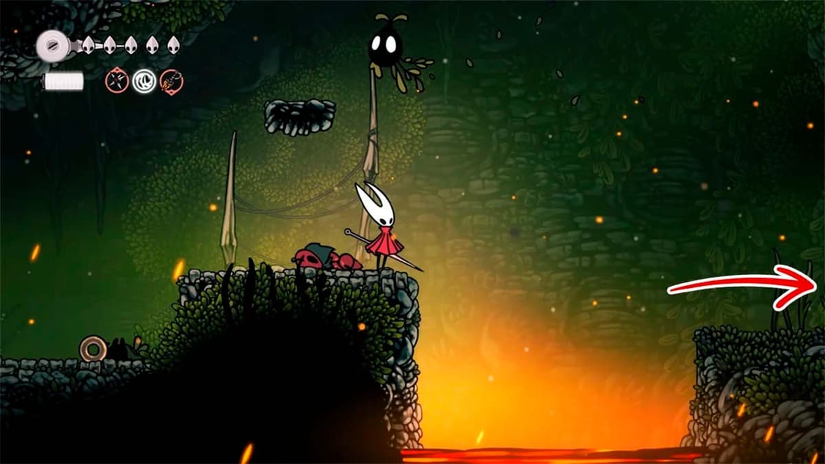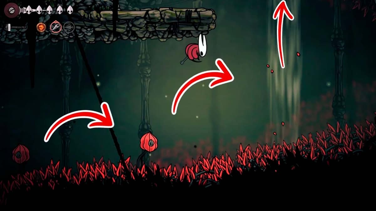 Наверху развилка. Иди вправо — впереди яма с шипами и три красных семенных капсулы. Придётся пого-прыгать по капсулам: держи стик/клавишу вниз над капсулой и атакуй.