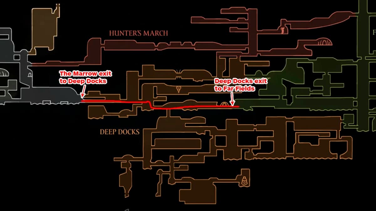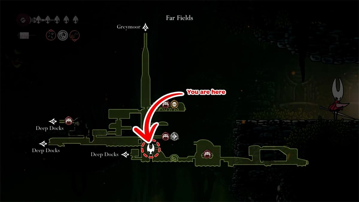 Иди на восток через Deep Docks. Проще всего попасть сюда из The Marrow. От входа в Far Fields двигайся дальше на восток. Встретится лава, на полу лежит мёртвый красный муравей, а сверху парит Flapping Fertid — можешь игнорировать или убить.