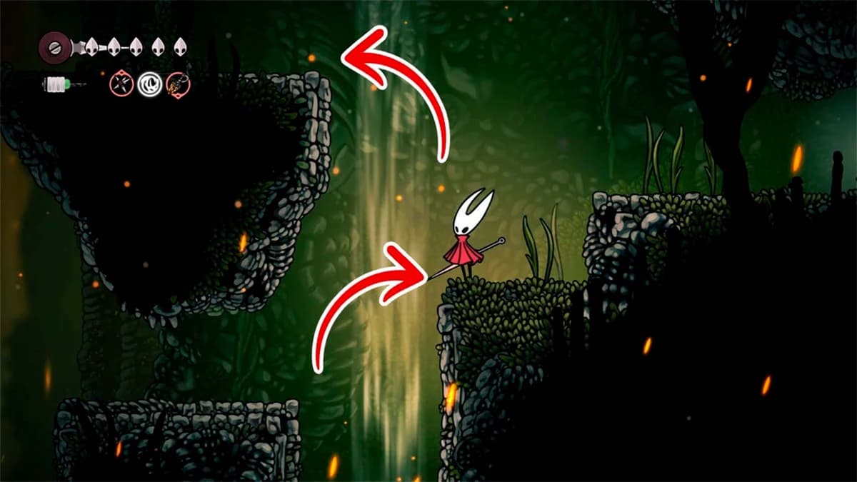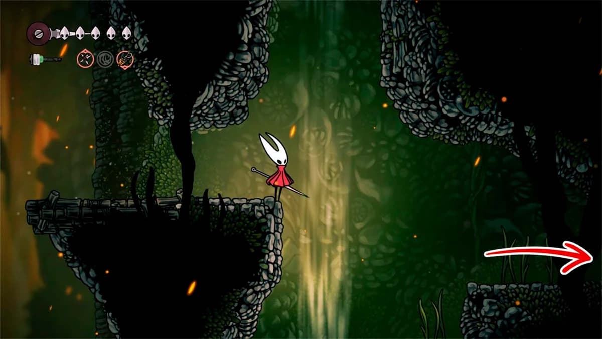 Впереди длинный шипованный колодец. Включай Drifter’s Cloak и плавно планируй, не задевая стенки — иначе урон и откат в начало участка.