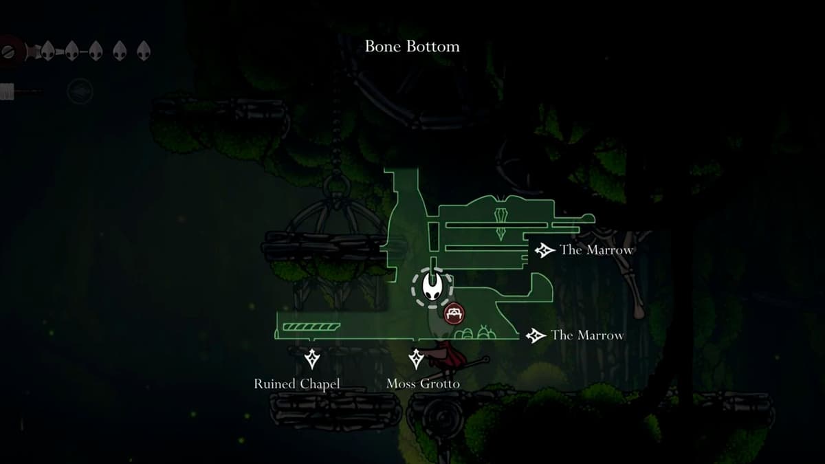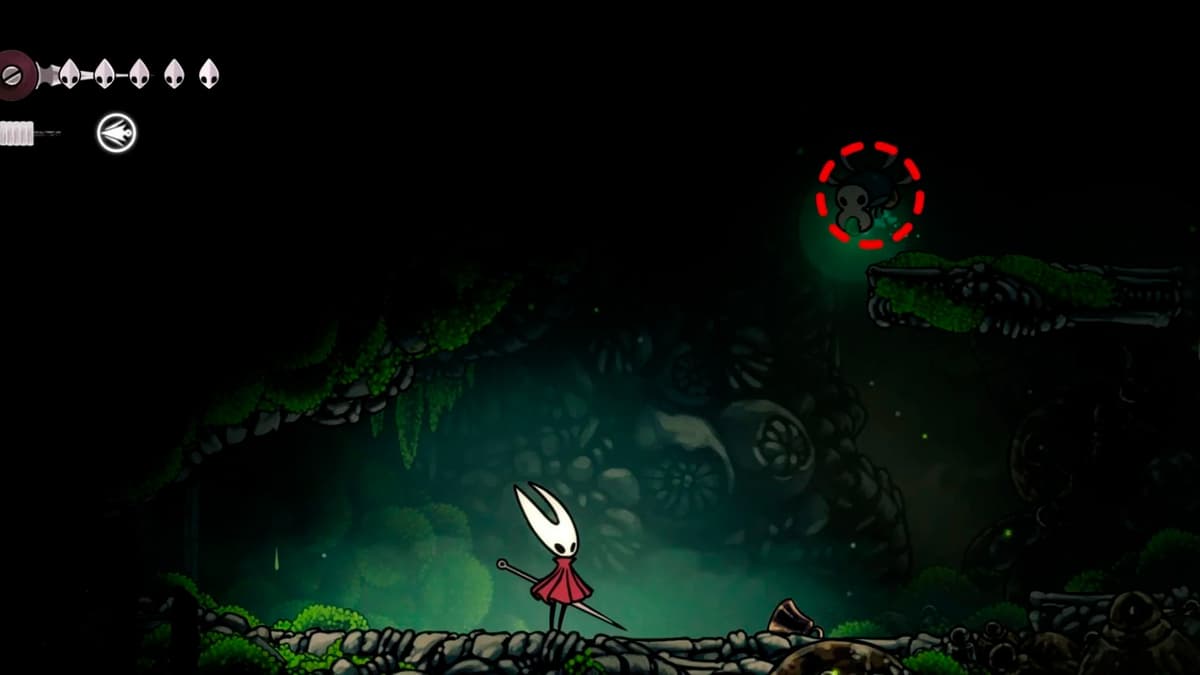 Самая tricky‐ягодка. Её держит летающий враг высоко над Bone Bottom. От верхнего входа в Mosshome двигайся по следующей траектории: далеко влево → вниз → влево → снова вниз по указателям. Внизу окажешься у лифта — обязательно дёрни рычаг, чтобы он начал тебя подбирать при падении. Дальше иди вправо и высматривай жука с ягодкой. Удобная арена справа — больше воздуха для батута: отпружинивай от моба, сбивай ягоду и не бойся оступиться — лифт тебя поймает.