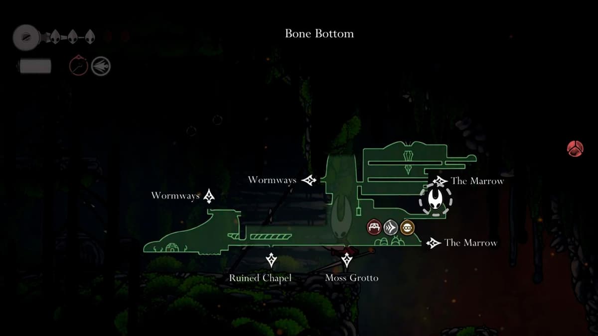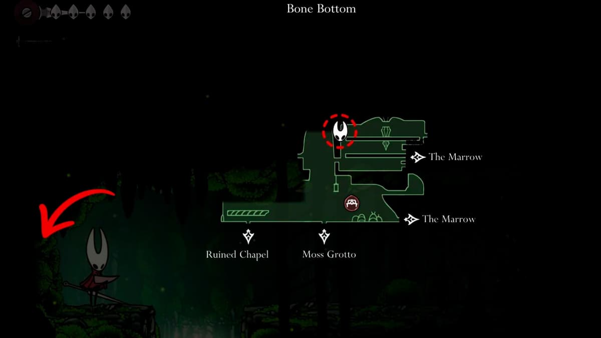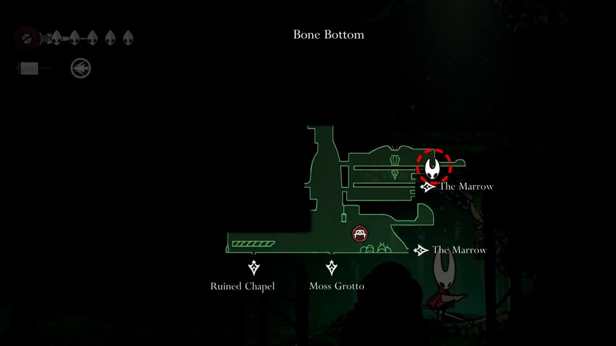 От лифта между Mosshome и Bone Bottom иди далеко вправо в следующий зал. Поднимайся до комнаты с двумя растяжками и сбей их с помощью Silk Strike. Когда станет тихо, ломай стенку слева за ловушками. Внутри лежит Silk Heart, а ещё откроется удобный шорткат.