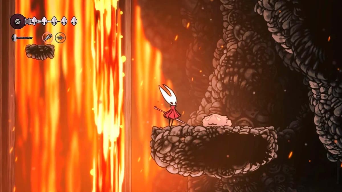 Иди в помещение с Bellway и упрись в левую стену. Сделай несколько ударов в прыжке, чтобы разломать её — за ней коридор с платформами и лавовыми водопадами. Двигайся вверх по таймингу: дождись просвета, прыжок — площадка — снова ждём. На самом верху тебя ждёт Lost Flea (потерянная блоха) — забирай награду и не падай в расплав.