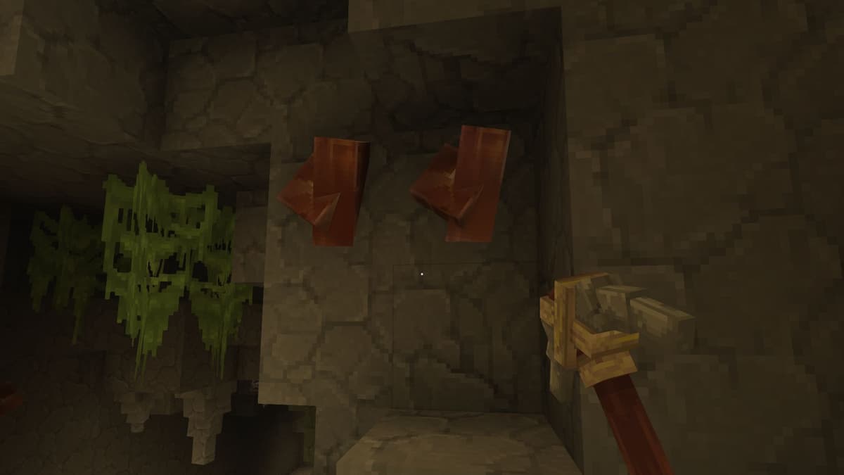 Дальше всё просто: ищи на стенах блоки с вкраплениями меди. Они заметные — из породы торчат коричневатые «жилки».