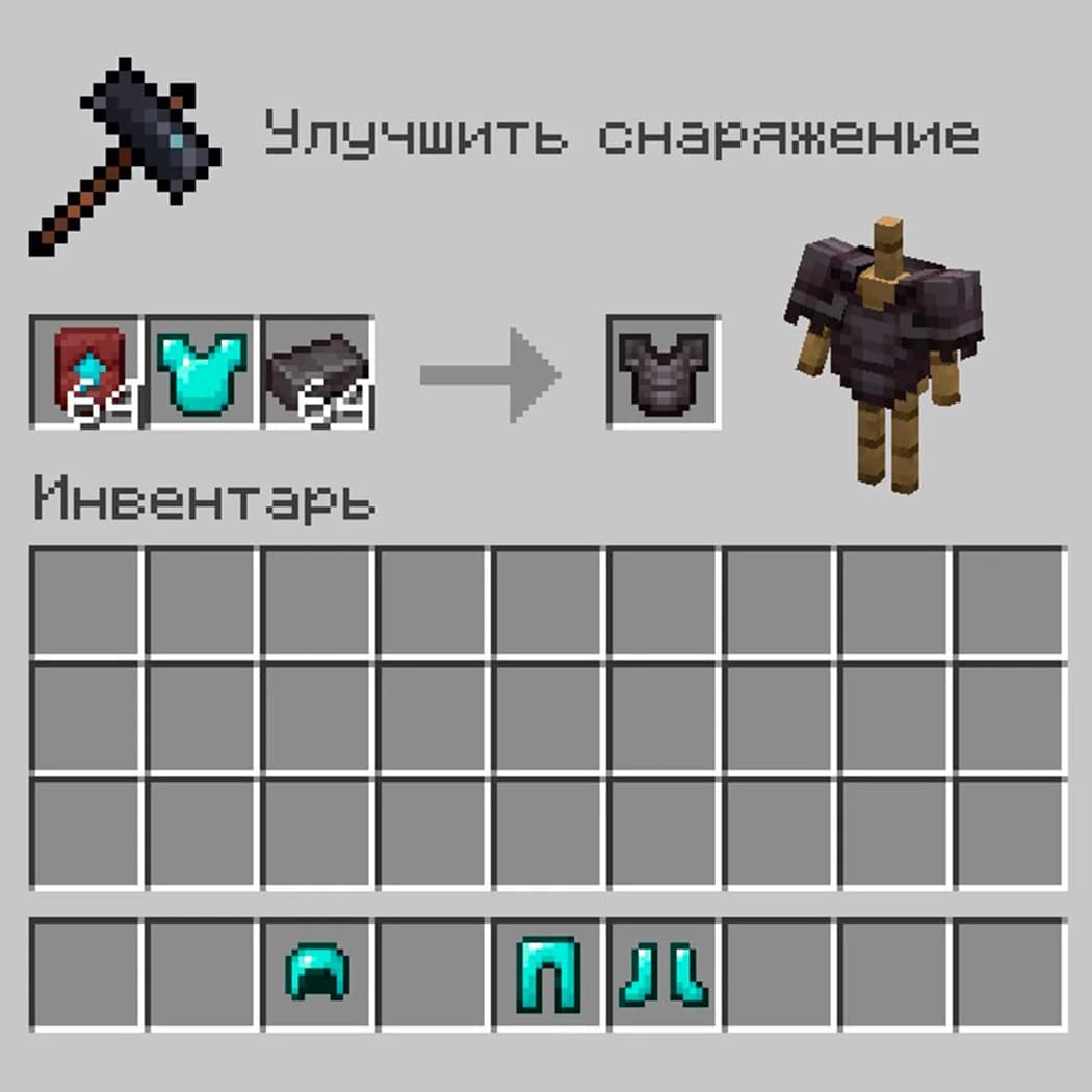 Бери алмазный шлем, нагрудник, поножи или ботинки, соединяй слиток и шаблон на кузнечном столе — получишь улучшенную до незеритовой версию предмета.