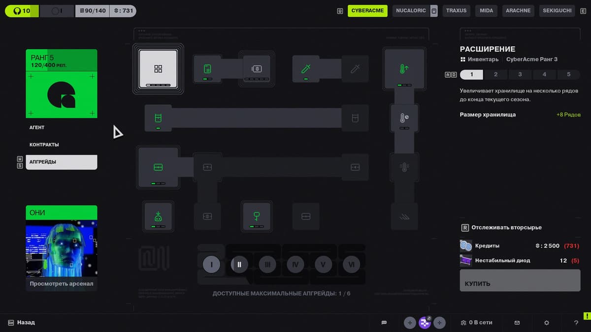 Выполняя квесты фракций, ты прокачиваешь ранг фракции, получая полезные награды. Например, расширение базового инвентаря. При этом ты также открываешь новые апгрейды, связанные с определённой корпорацией. Например, CyberAcme позволяет увеличить количество кредитов, получаемых за сбор датакарт, и открывает продажу улучшенного оружия в арсенале.