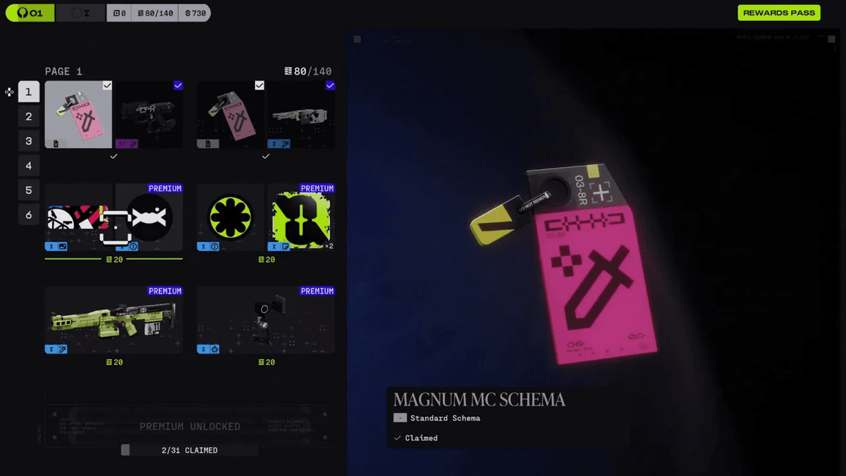 Пропуск состоит из 6 страниц, забитых скинами для оружия, аватарками, фонами для карточки игрока и другой косметикой, а также «схемами», пополняющими арсенал особыми предметами.
