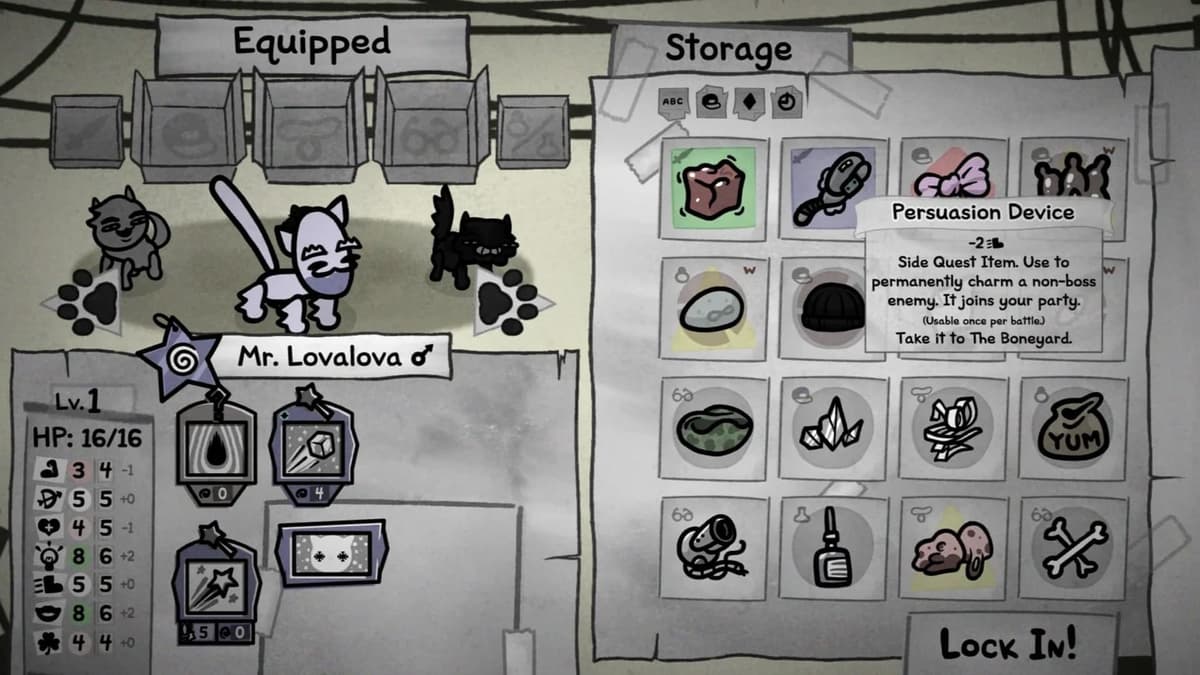 По мере прохождения сюжета Mewgenics Доктор Биниз начинает раздавать предметы для побочных заданий. Один из них — Persuasion Device. Выглядит как странная машинка, но смысл простой: получаешь, носишь с собой и доходишь до нужного места.