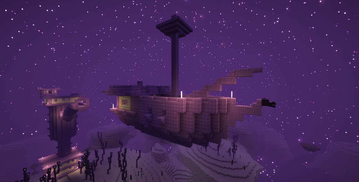 Корабль не стоит на воде, а летает над землёй рядом с башнями города. Внутри обычно сидит шалкер, а в конце ты найдёшь рамку, в которой весят Элитры. А ещё рядом будет стоять сундук с хорошим лутом.