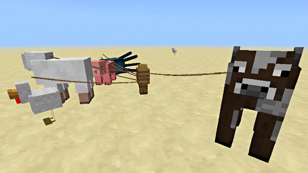 Поводок — это «верёвка», которой можно вести моба за собой и фиксировать на заборе. Работает с большинством дружелюбных и нейтральных существ: коровы, овцы, козы, свиньи, куры, лошади, ослы, мулы, ламы, волки (собаки), кошки, пчёлы, лисы, лягушки, аксолотли, козы, верблюды и другие мирные обитатели. С враждебными — далеко не всегда; с жителями — нельзя. Если сомневаешься, наведи прицел: если появляется действие «Использовать», значит, этого моба можно «зацепить».