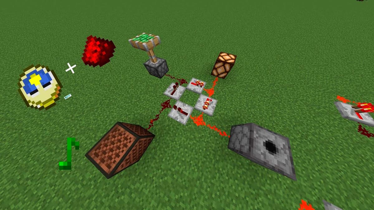 Вода, медные плиты, нотные блоки. Короткий импульс из hopper‑clock включает фонтан, огни и звон колоколов. Зритель видит, как «кто‑то» нажал кнопки, и возвращается вечером — проверить, «не заржавел ли друг».