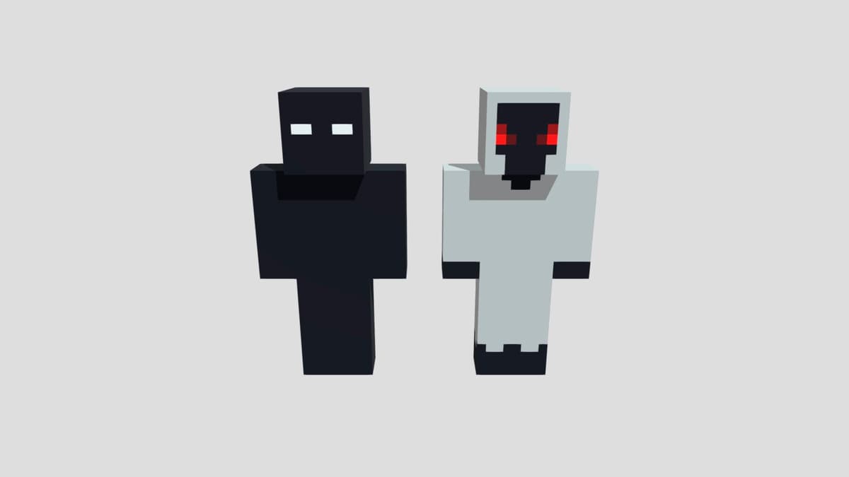 Ещё один приём — безликие скины. Обычный костюм, капюшон, но лицо — пустая маска. Такой персонаж может просто стоять в углу комнаты, и уже достаточно, чтобы стало не по себе. Стримеры часто используют такой образ, чтобы пугать зрителей: появляются в кадре без слов, просто входят в комнату и смотрят.